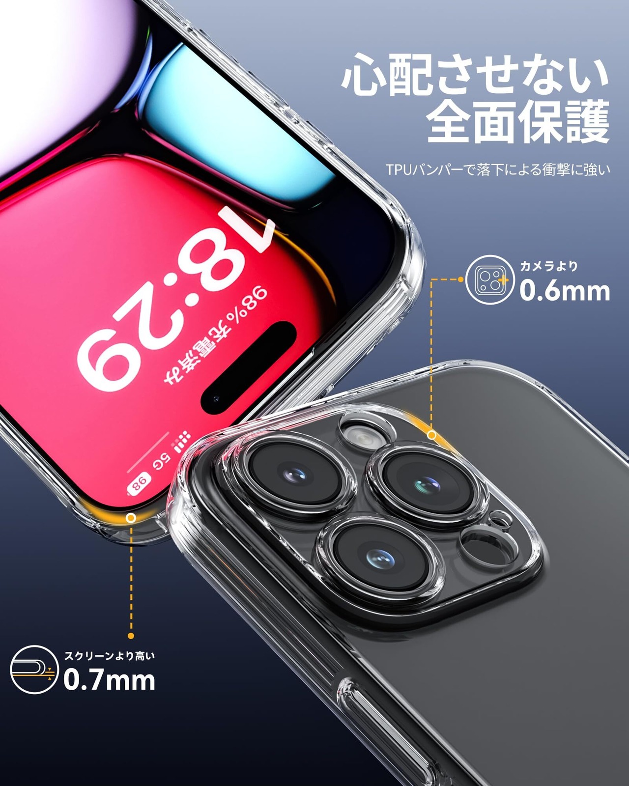 【高透明度・黄変防止】高級熱可塑性ポリウレタン(TPU)素材を採用する、従来のケースと比べてより透き通った透明感を保つことができ、長期間経ってもケースが黄変しにくく、iPhone16Pro本来の美しさを楽しめます。