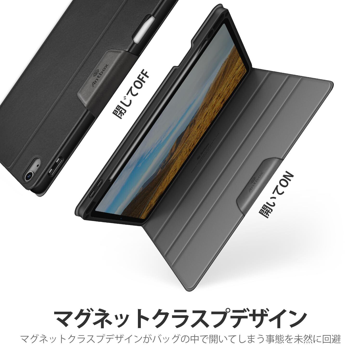 4、【電力損失を防ぐ】カバーに配置されたマグネットによりスクリーンに吸着するため、カバンの中でも勝手に開くことがありません。マグネット式バックルも更なる保護を提供いたします。