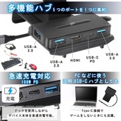 搭載ポート (5-in-1): HDMI 2.0 ポート ×1 (最大 4K@60Hz出力) USB Type-C PD入力ポート ×1 (最大100W入力対応) ※充電器は別売 USB-A 3.0 ポート ×1 (最大 5Gbps) USB-A 2.0 ポート ×2 (最大 480Mbps)