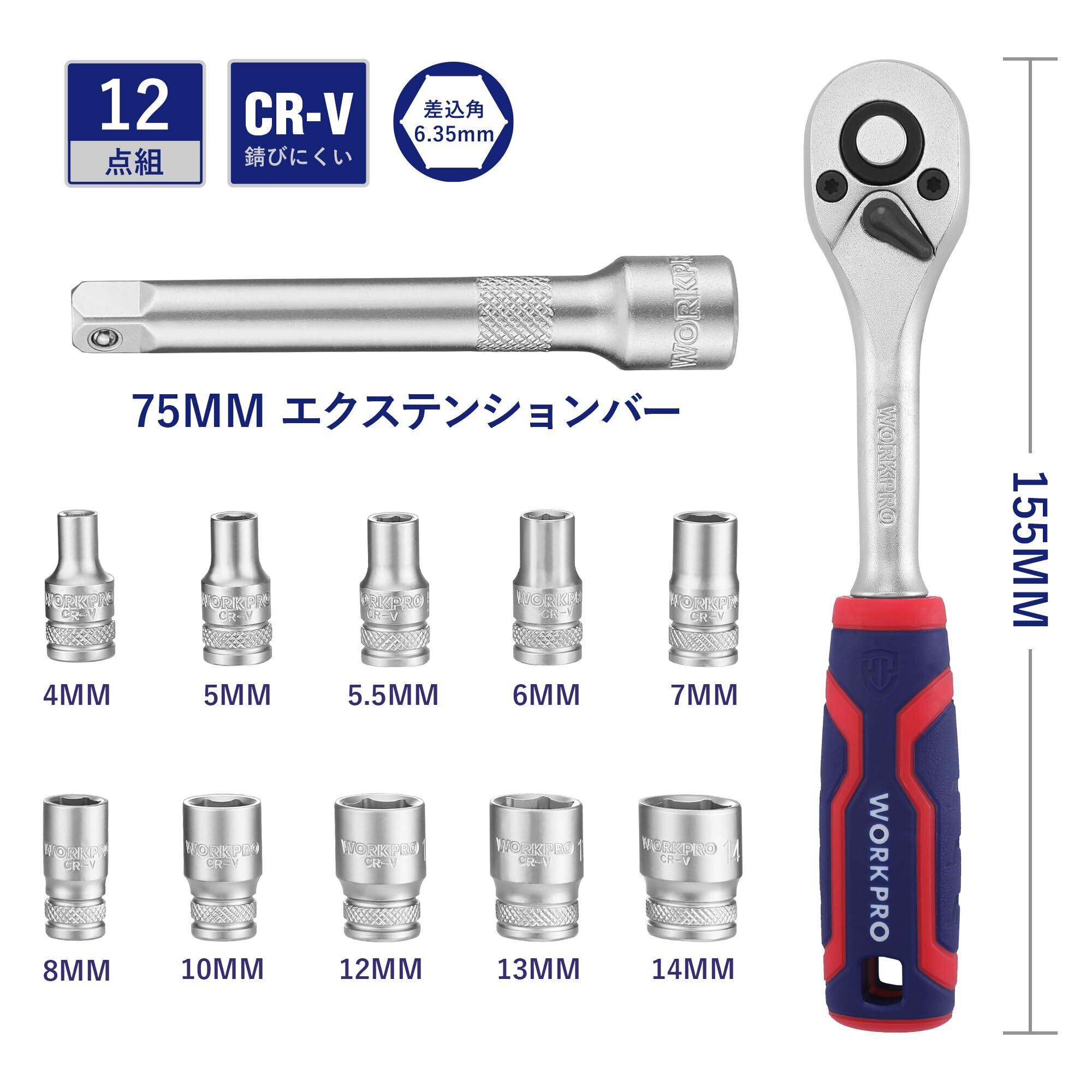 WORKPRO ソケットレンチセット ラチェットレンチ 差込角6.35mm 12点組 六角ソケット クイックリリースラチェットハンドル 車載工具 ホルダー付き 車 バイク 機械点検 メンテナンス | yankees