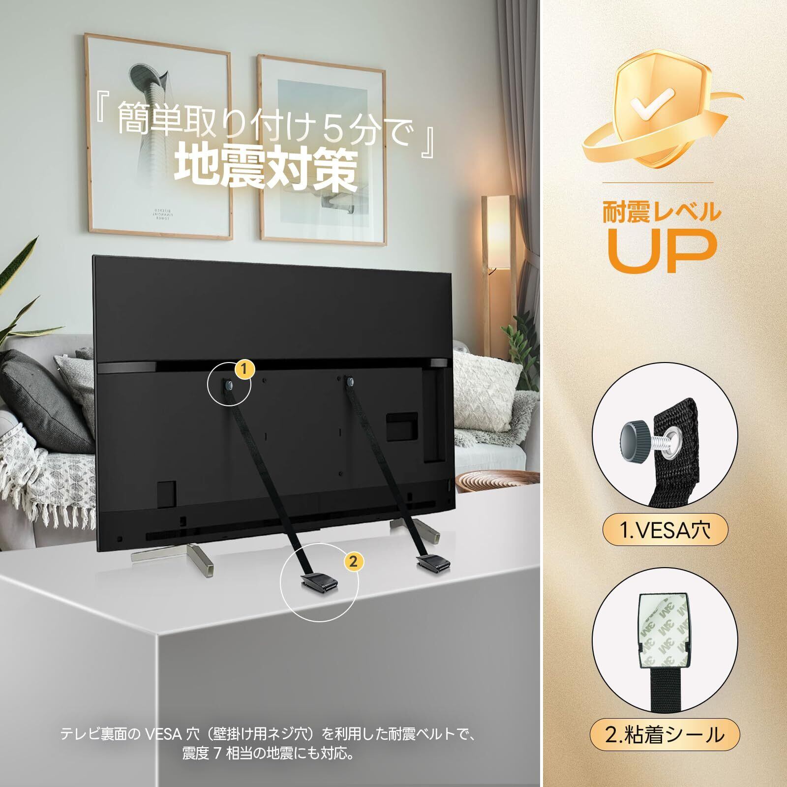 【耐震ベルト・プレミアム】震度7相当の振動試験をクリアし、耐震力はトップクラス。テレビ/液晶モニター裏面のVESA穴を利用して、転倒を防止します。地震などの転倒を防ぎ、ケガを予防する安全対策アイテムです。