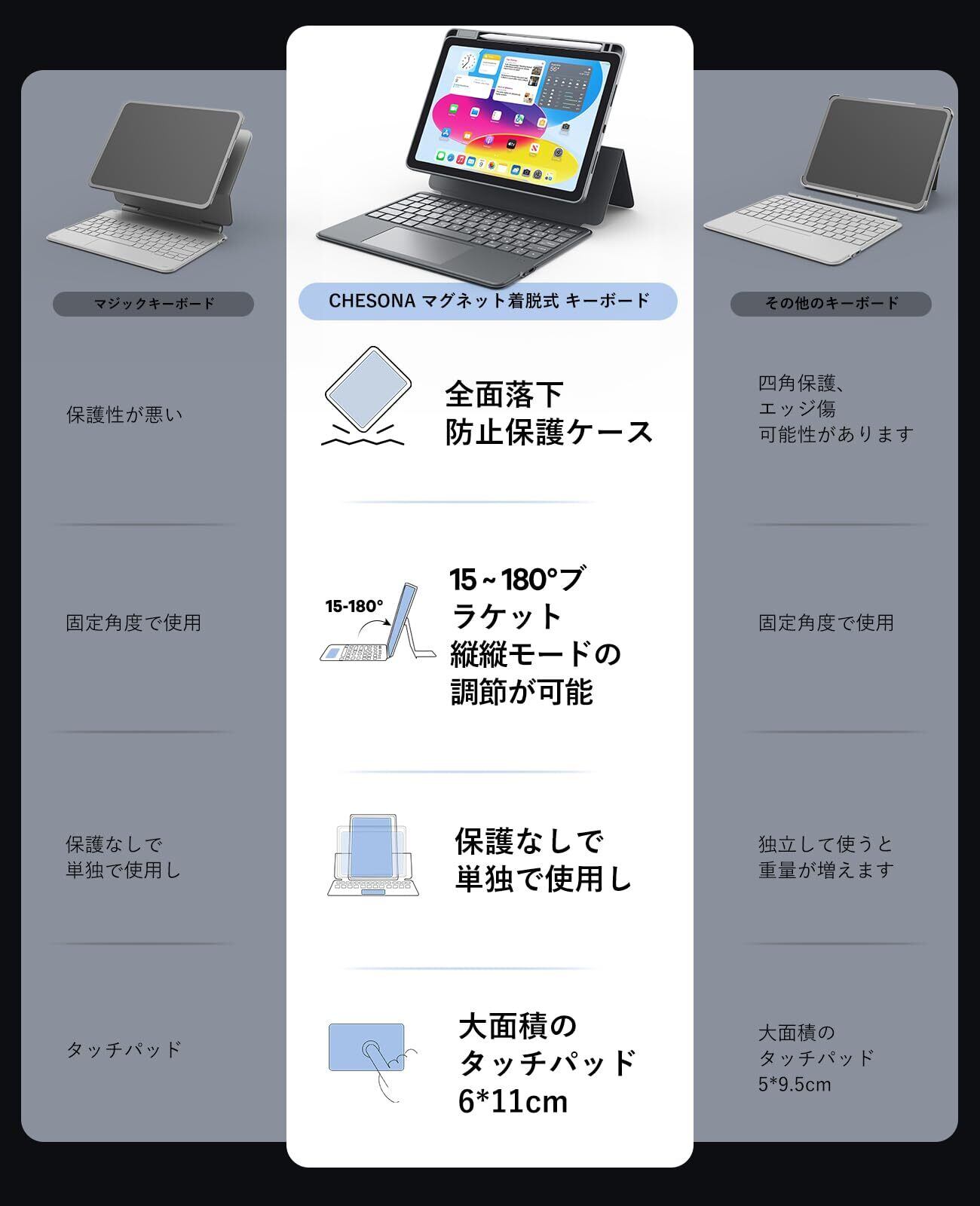 CHESONA iPad 10/11世代 キーボード 縦向き/横向きモード マグネット着脱式 取り外し可能な独立型ケース キーボード 多機能タッチパッド搭載 7色バックライト 15°~180°調整可能ブラケット落下防止 耐傷性 type-c充電式 [ペンシルホルダー付き] Pencil 収納可能 ipad 11(A16)世代 2025年発売 iPad 10世代対応 [ダークグレー]