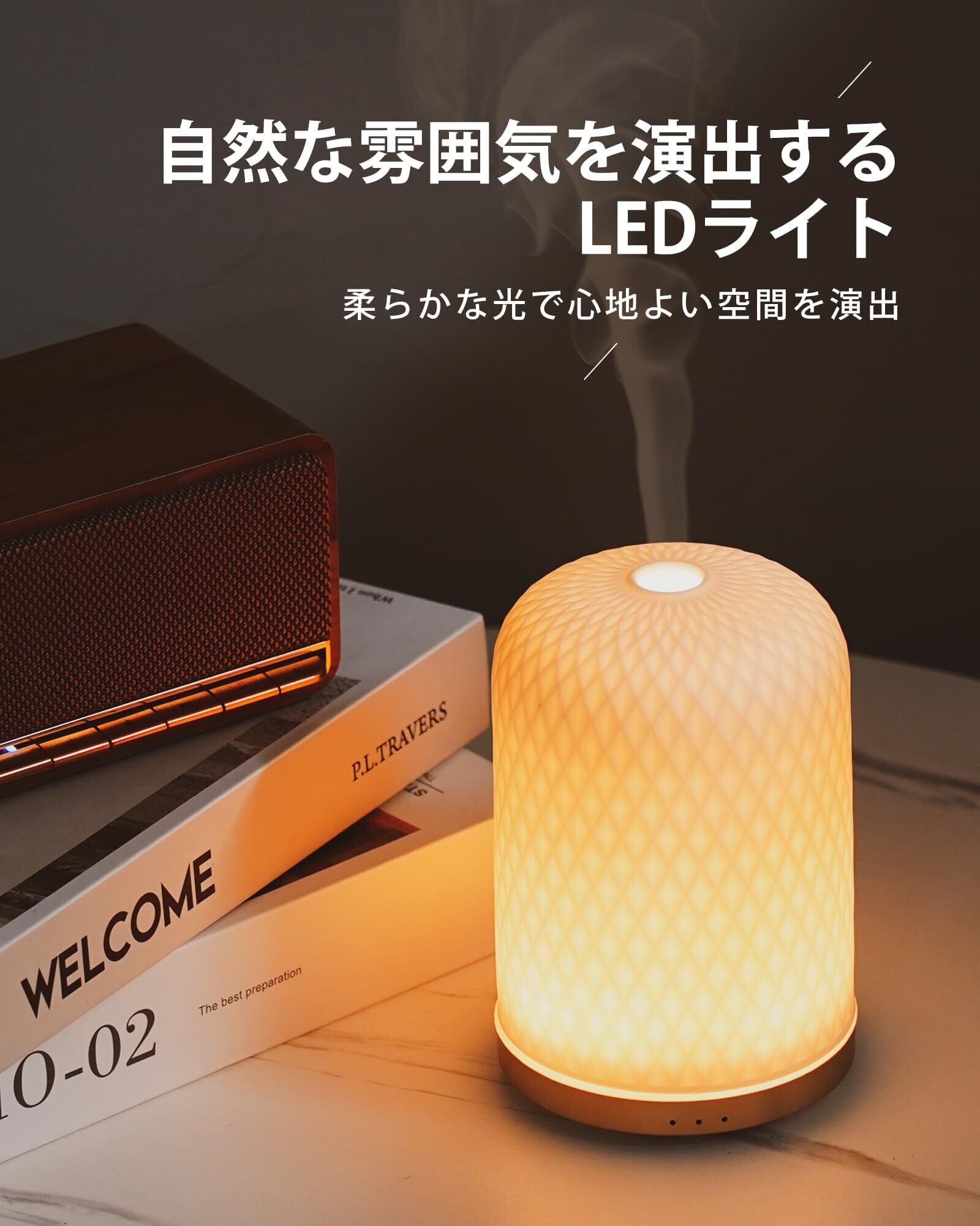 この小型でコンパクトなデザインは、卓上にぴったり!110MLの水タンクを搭載し、最大6時間の連続使用が可能です。超音波式による静かな加湿で、心地よい香りと潤いを同時に提供します。空焚き防止機能も搭載しているので、安心して使用できます。そして、タイマー機能により運転時間を好きなように調整できます。
