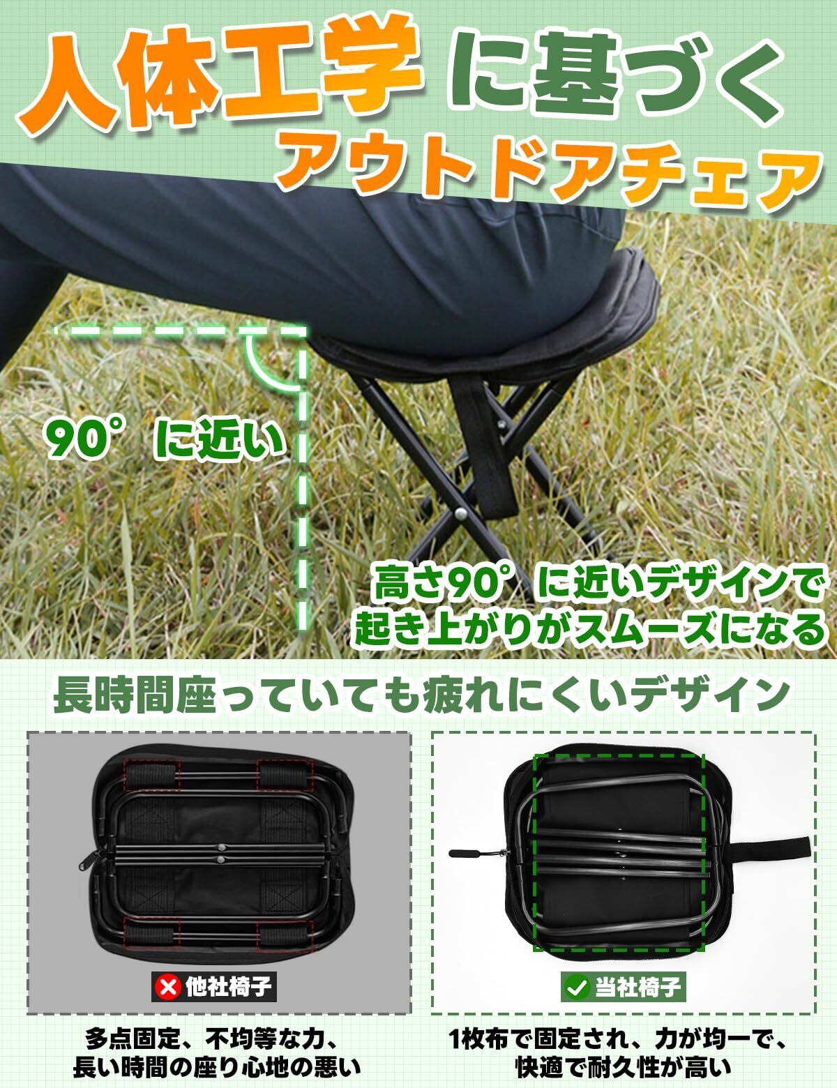【人体工学・超快適】アウトドアチェアは人体工学的に設計され、椅子の高さが90度まで可能で、体を効果的に支え、座り方のストレスを軽減し、長時間使用しても快適に保つことができ、長時間キャンプやアウトドア活動に適しています。