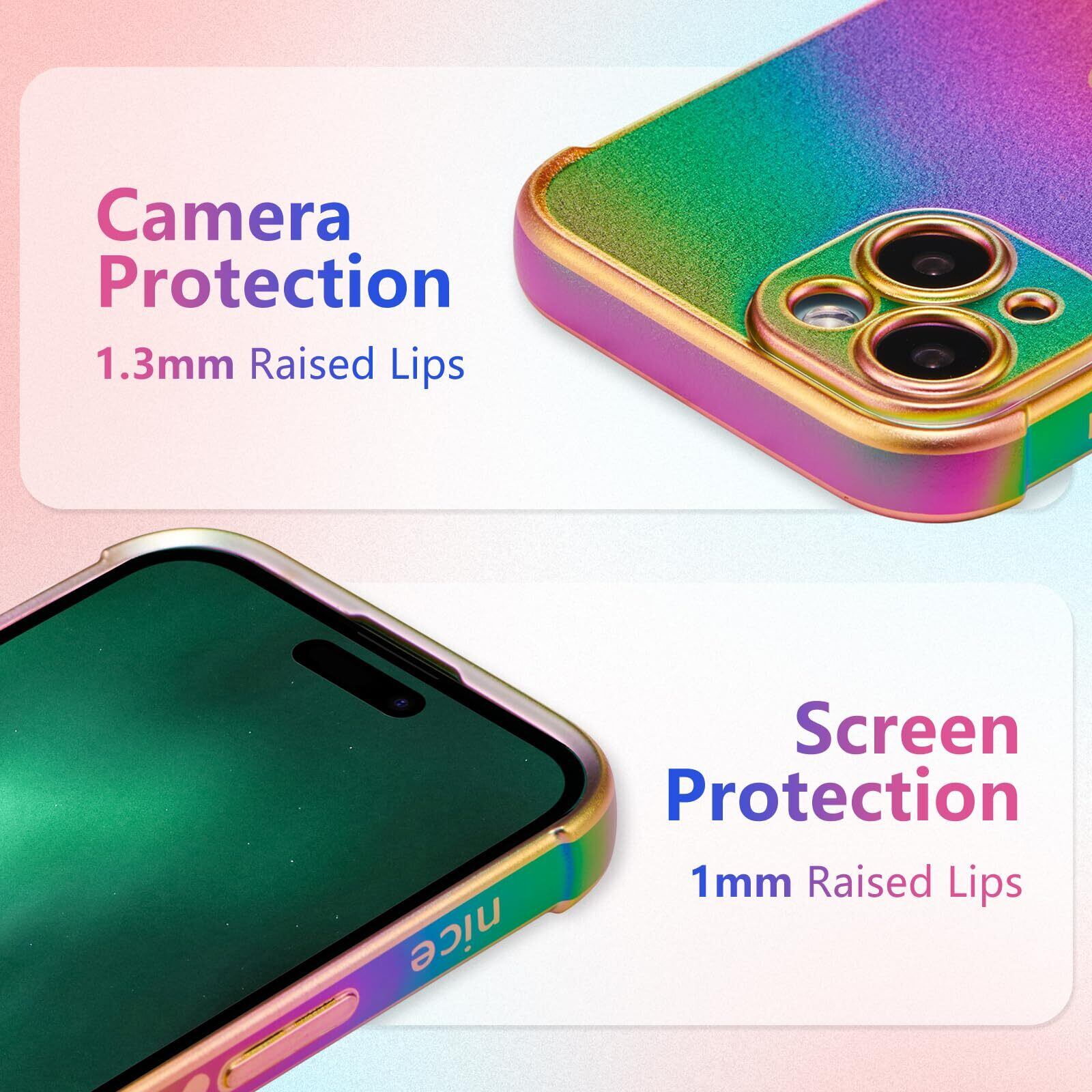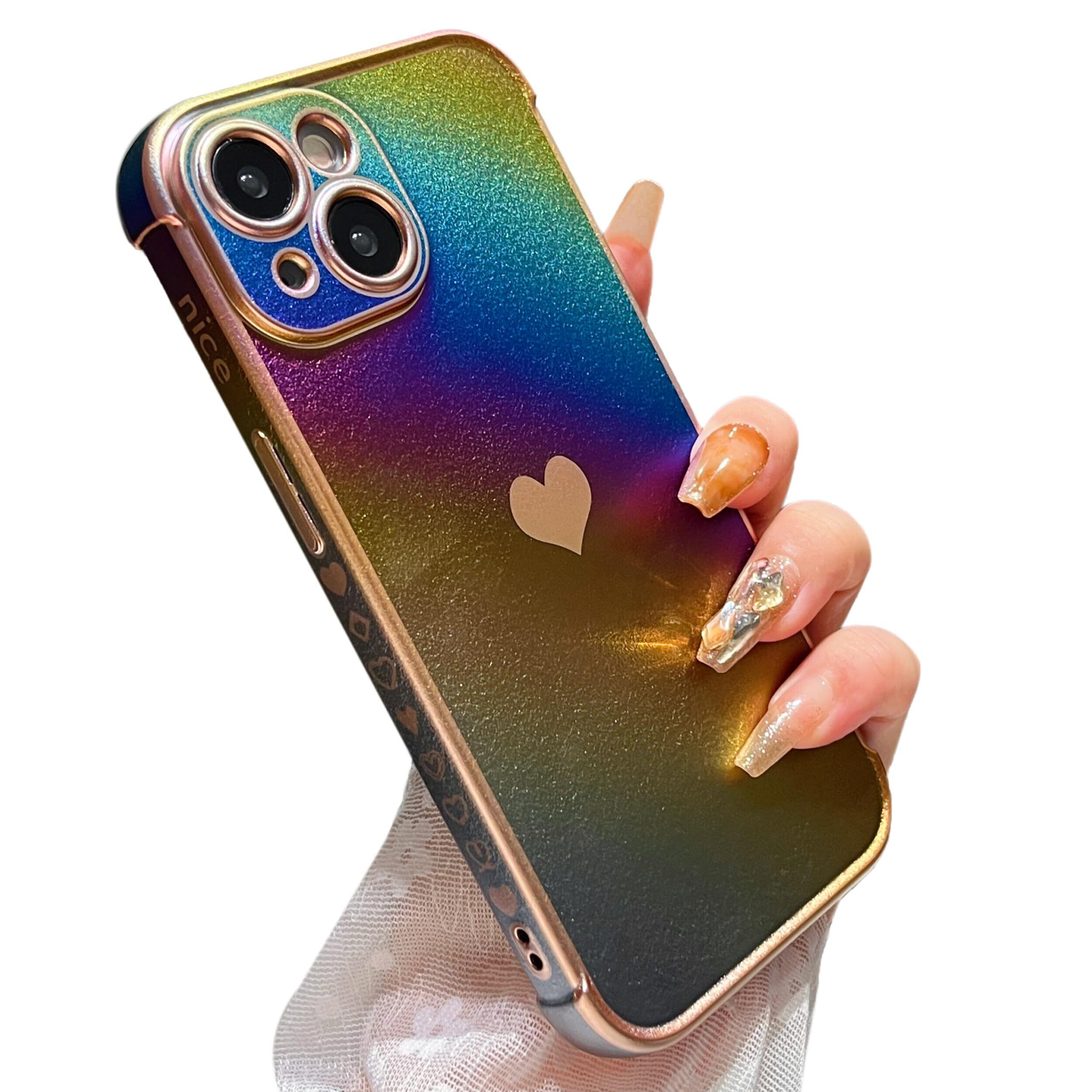 【虹色デザイン】電気メッキ技術により、縁と小さなラブハートパターンを装飾し、メッキされた縁は決して色褪せず、ケース全体が光沢があり、異なる動きや光によって色が変化します; すべてがこのiPhone 15ケースをよりスタイリッシュにし、目を引く;女の子と女性のための素敵な贈り物。