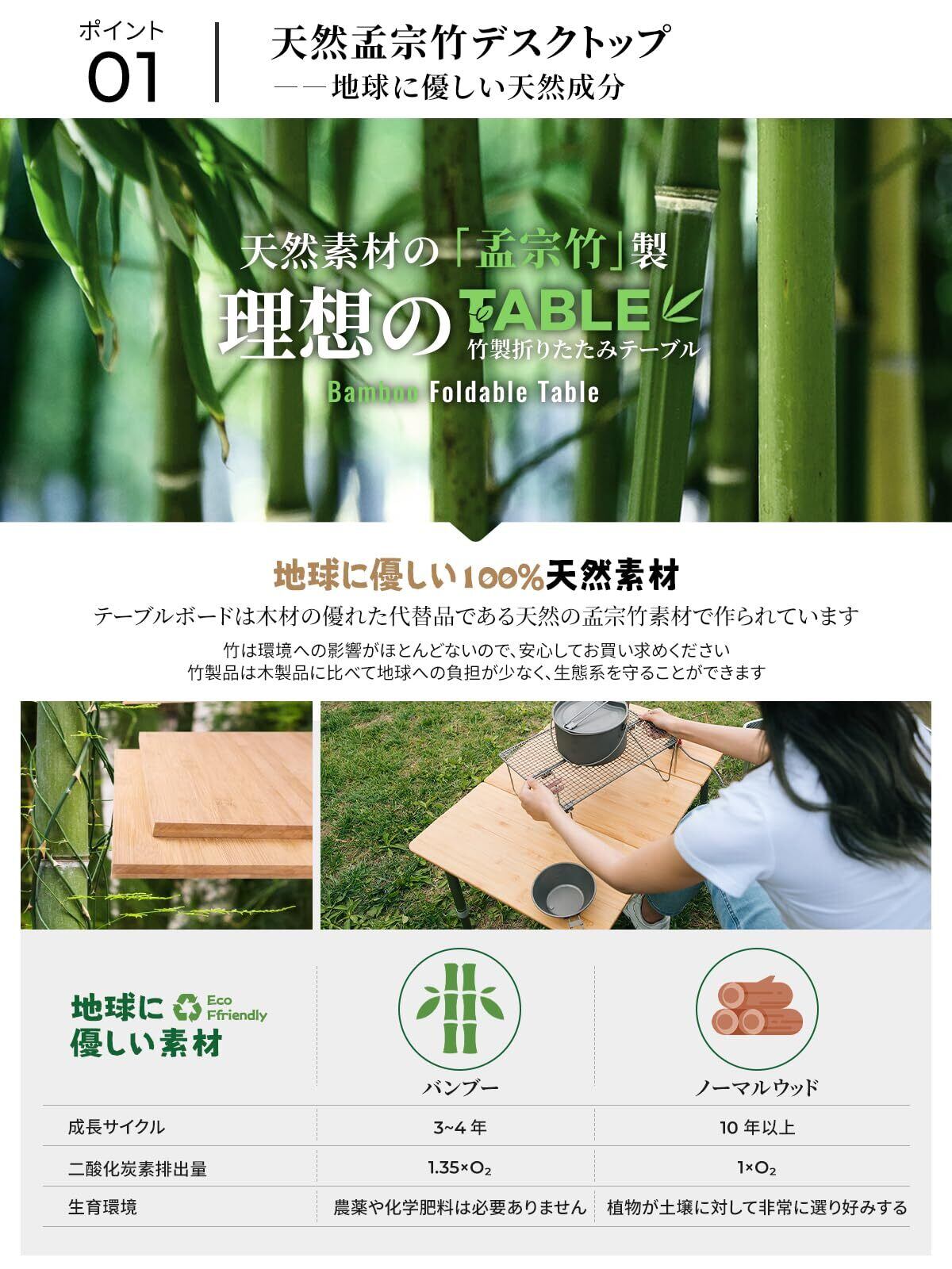 【高級な天然竹製天板】キャンプテーブルの天板は、自然の楠竹を使用し、12の工程を経て熟練の技で作り上げられています。楠竹は自然な美しさを持ち、耐久性にも優れており、日常の使用にも十分に耐えることができます。当社の職人たちは竹の工芸に精通しており、熟練した手仕事によって楠竹材料を滑らかなテーブル面に仕上げ、自然の木目と特有の質感を表現しています。あなたの生活空間に自然な美しさと高品質をもたらします。