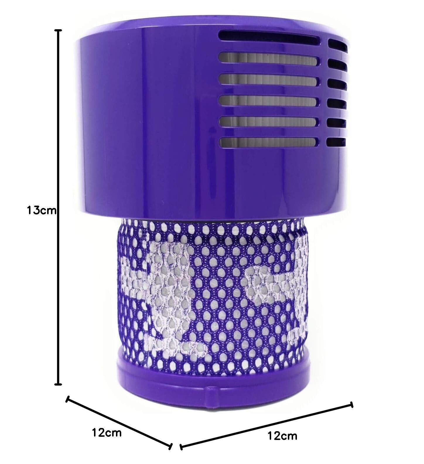 【ご注意】日本国内で販売されているV10シリーズ (型式:SV12~) 付属の純正フィルター(型番:969082-02)と比較して、後方の排気用フィルター部分が約14mmほど長くなります。また掃除機本体へフィルターを取り付ける際、差し込みの時に若干固く入りづらくなりますが、取付使用可能です。