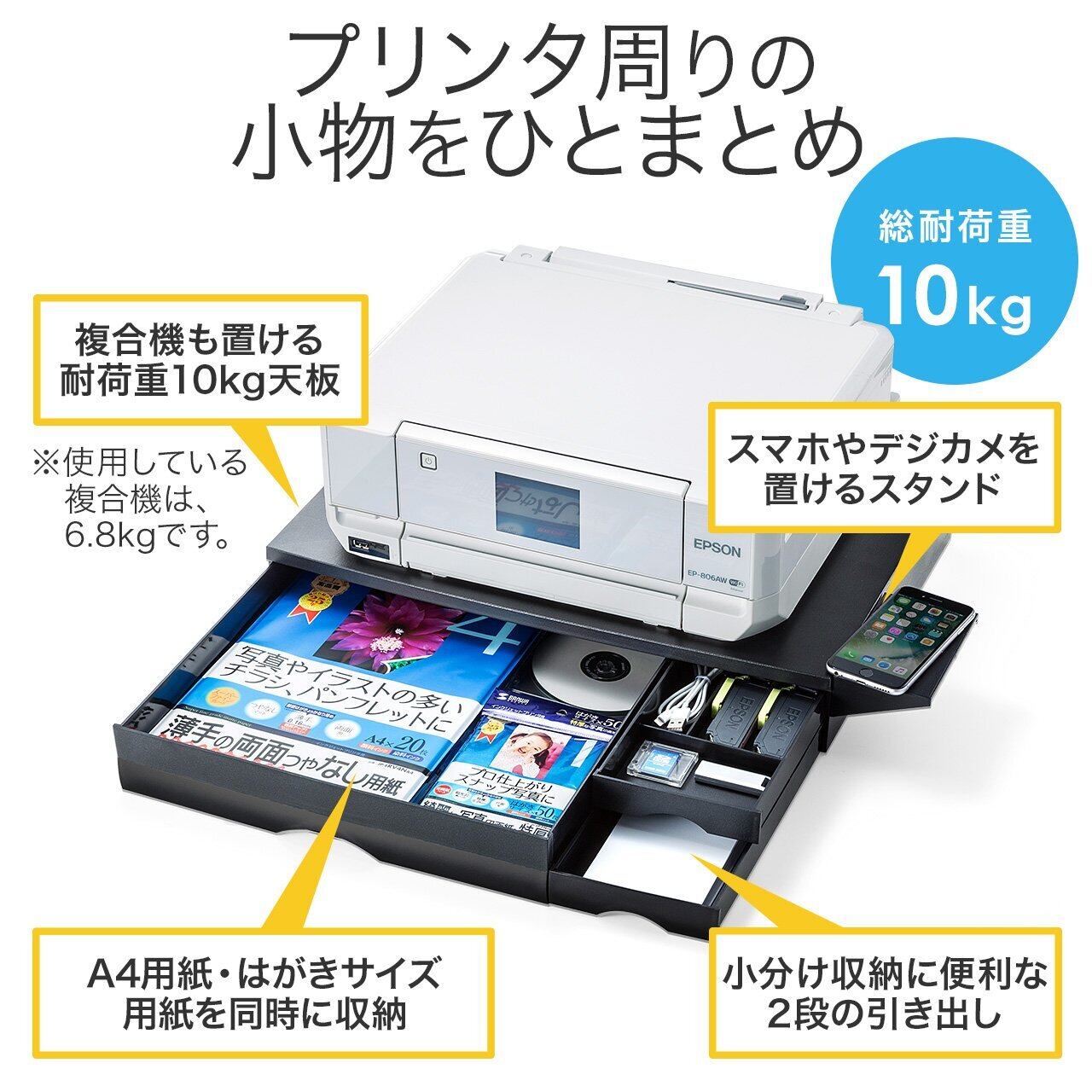 ・サンワダイレクト プリンター台 卓上 引き出し付 A4収納対応 プリンタステーション 100-PS006