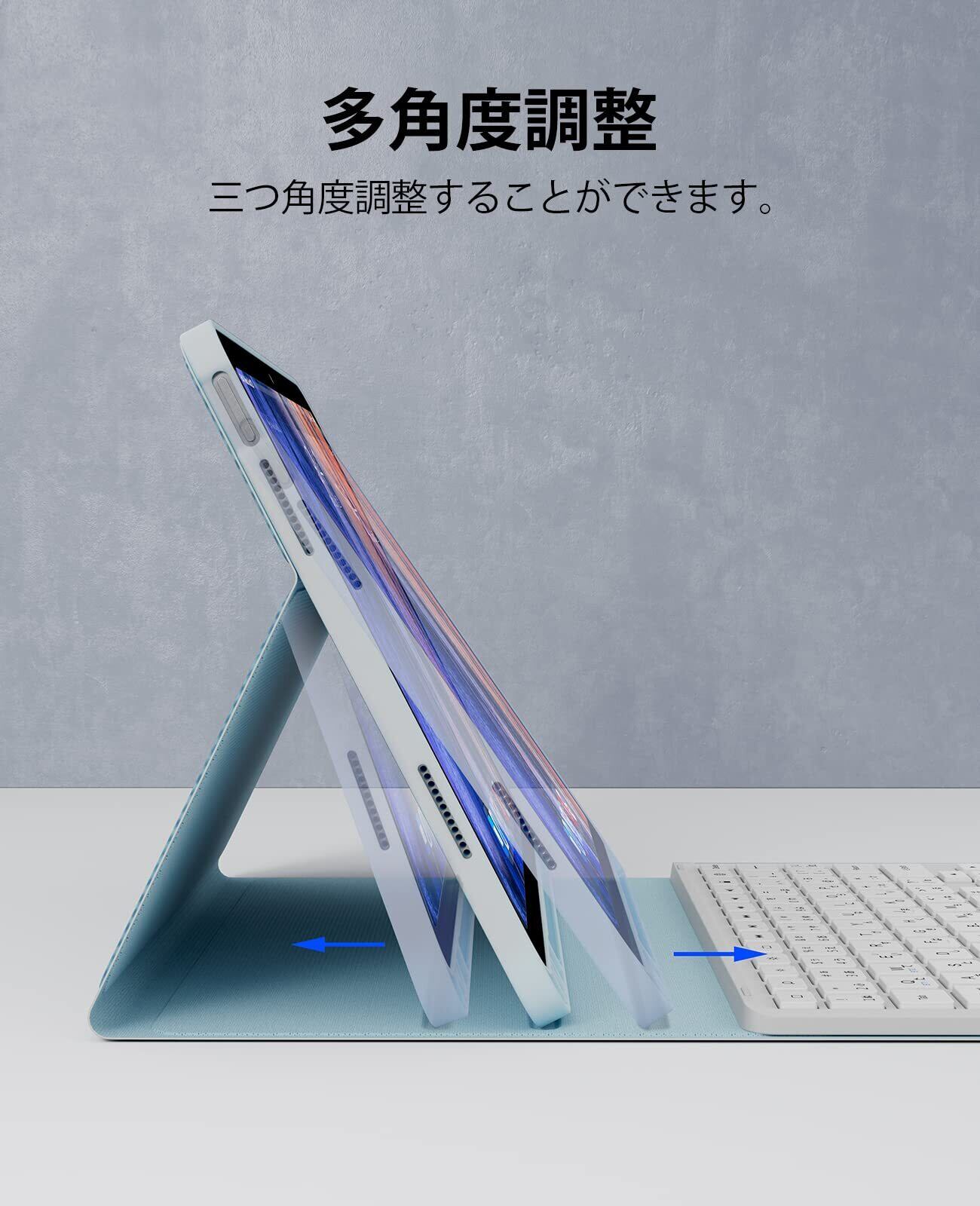 薄型で軽量な設計により、持ち運びも簡単です。さらに、脱着式で多角度調整も可能だから、自分の好みに合わせて快適に使用できます。ペンシルホルダーも付いており、外出先でも便利にiPadを使うことができます。