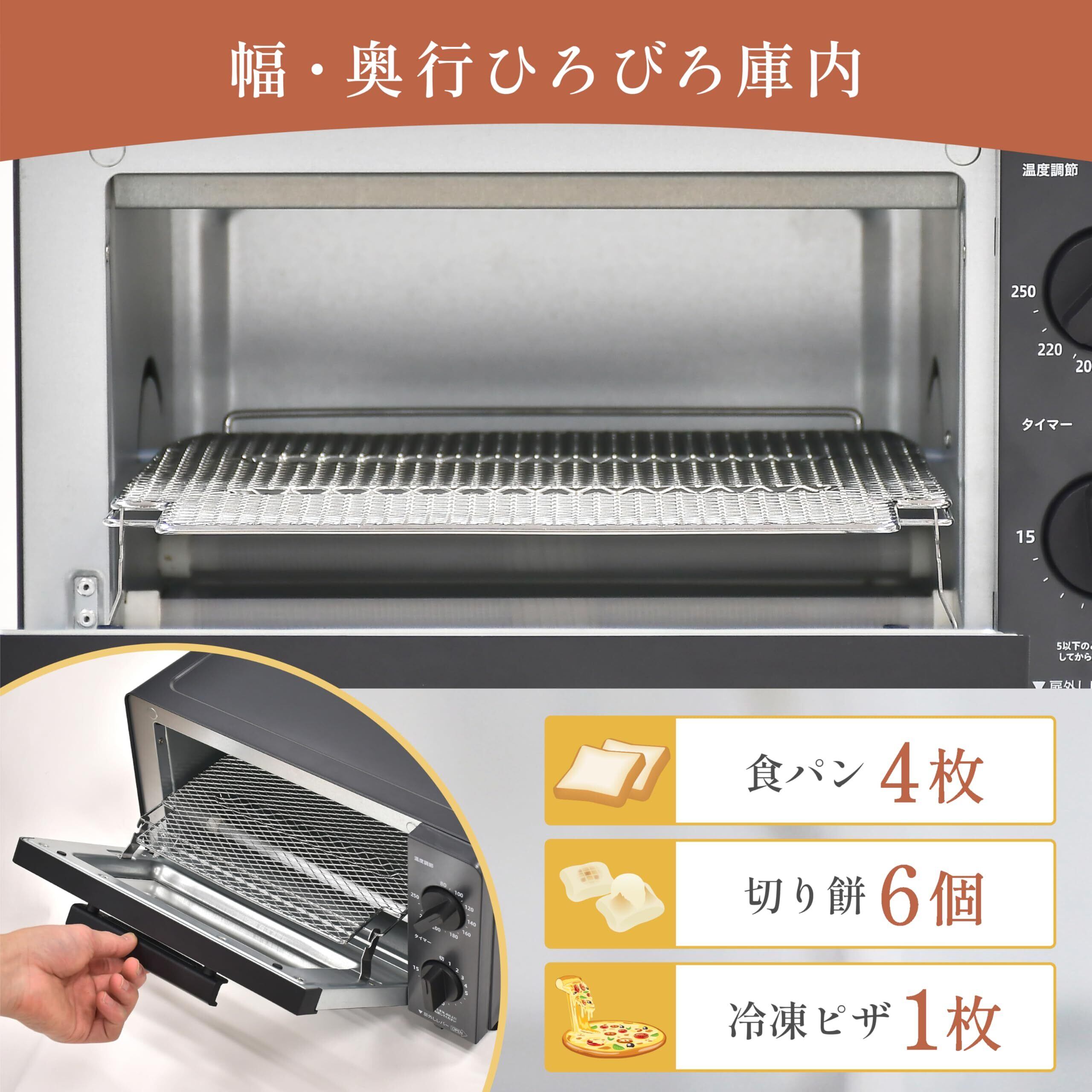 【4枚焼きビッグ庫内】ご自宅で焼きたてのサクッとトーストが楽しめるオーブントースター。1度に4枚まで食パンが焼けるビッグ庫内で、忙しい朝でも家族分のトーストが一気に作れます。