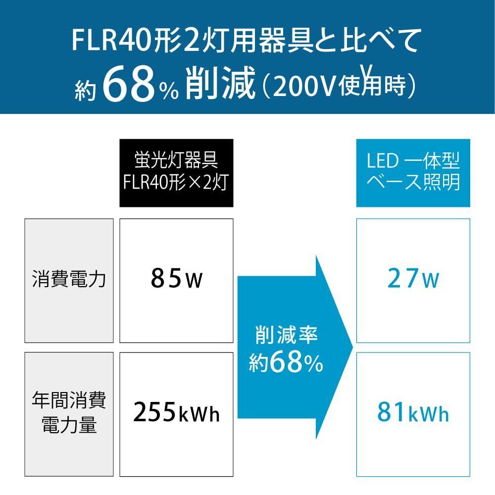 このLEDベースライトは4000ルーメンの強力な明るさを誇り、FLR40×2灯相当の明るさでオフィスや作業場をしっかり照らします。昼白色(色温度5000K)は、視認性が高く、疲れにくい環境を実現します。