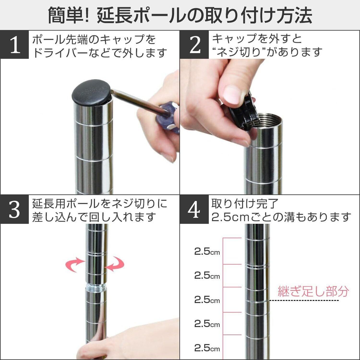 「ドウシシャ ルミナス スチールラックパーツ」をぜひお求めください!この便利な高さ延長ポールを利用することで、あなたの生活空間がさらに効率的かつ機能的になることでしょう。