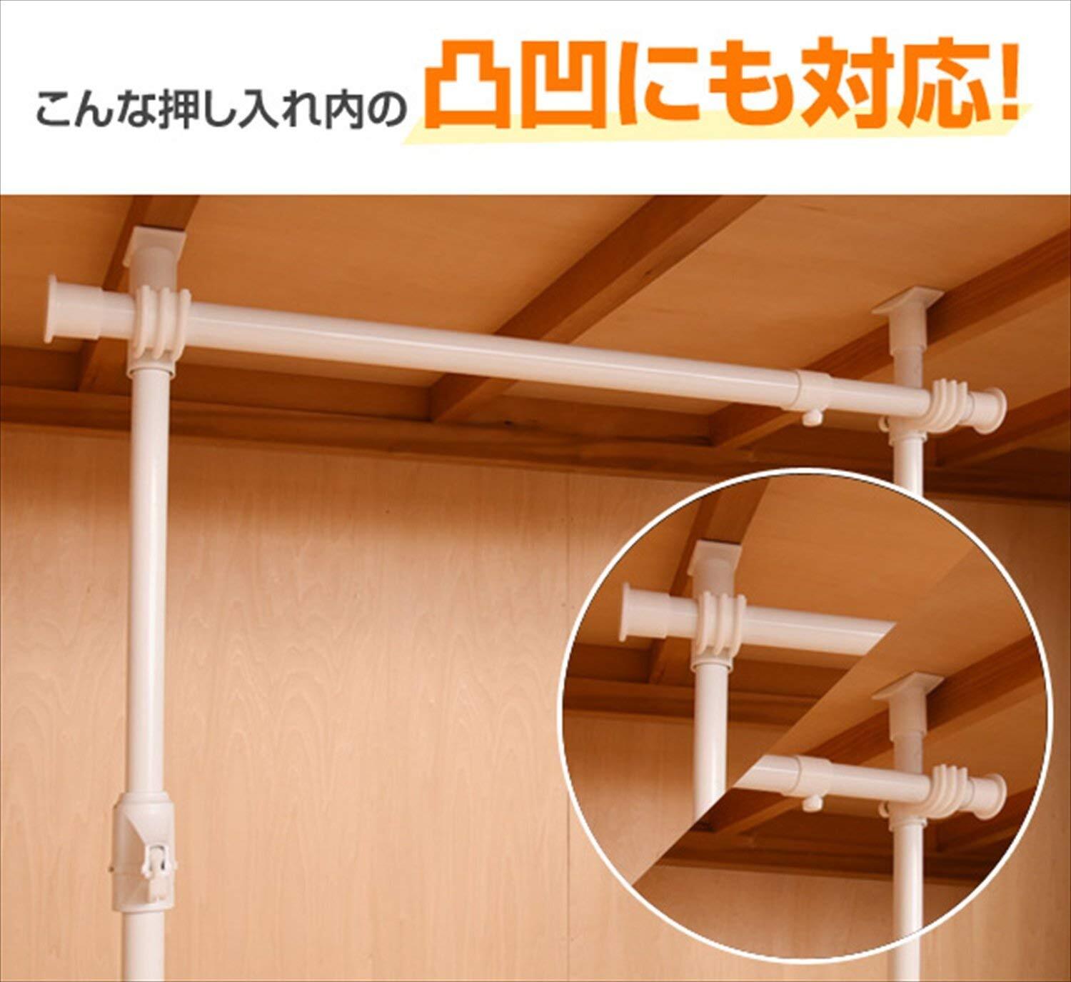 ●ネジ・クギ不要、賃貸でもできる、押入れをクローゼットにかんたんリメイク●ヨコ向き、タテ向き、どちらでも設置できるつっぱり固定式●たてよこ伸縮式、押し入れ内の凸凹にも対応する高さ調整&幅は最大120cmでたっぷり収納●強度も安心、耐荷重30kgで服もしっかり収納●ボタンを押して上げるだけ、オリジナル突っ張り機構で超カンタンに設置可能●組立品(組立時間:約10-20分)