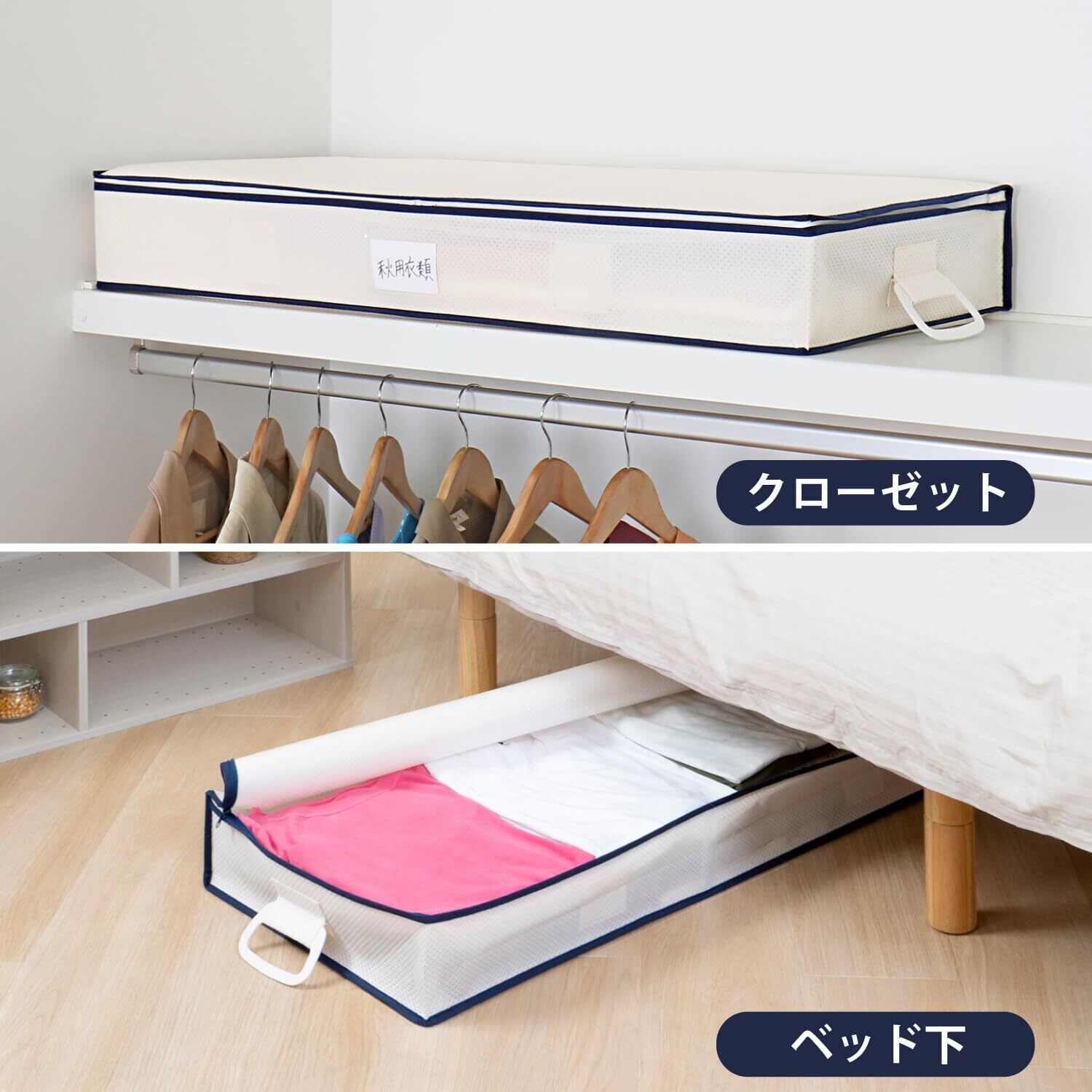【持ち手付きで持ち運びしやすい・隙間収納】:両サイドに持ち手付きでベッド下からの出し入れや持ち運びもラクラク。クローゼットの上部の棚や押し入れの隙間などにも。