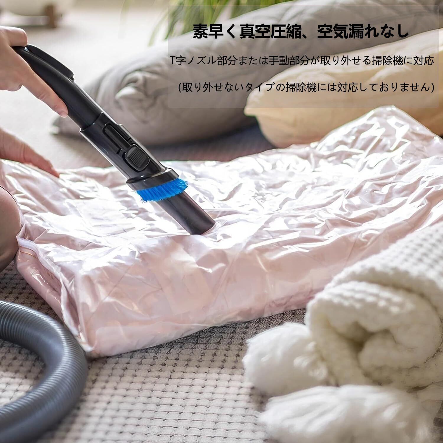 スティック掃除機や取り外し可能な掃除機に対応しているため、手軽に圧縮が可能です。この圧縮袋を使えば、面倒な操作が少なく、あっという間に収納が完了します。