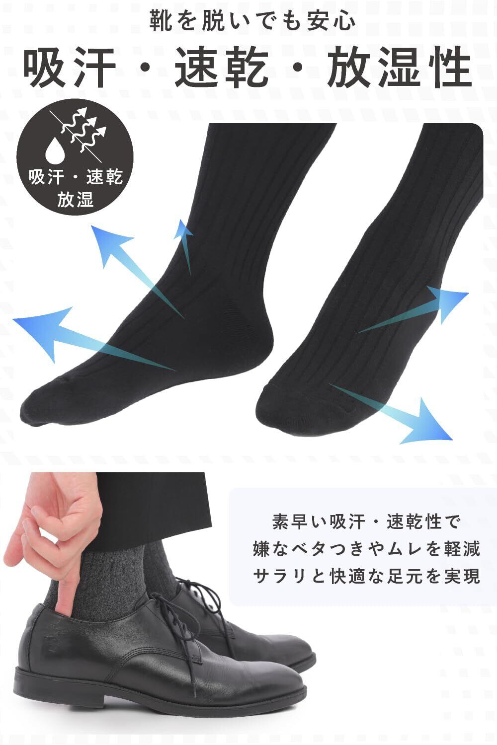 上質なコーマ綿を使用しているため、優れた吸汗性と通気性を発揮。これにより、足元をいつでも快適に保ちます。さらに、左右兼用のデザインで、脱ぎ履きも簡単です。仕事やビジネスシーンで必要な機能を全て兼ね備えています。