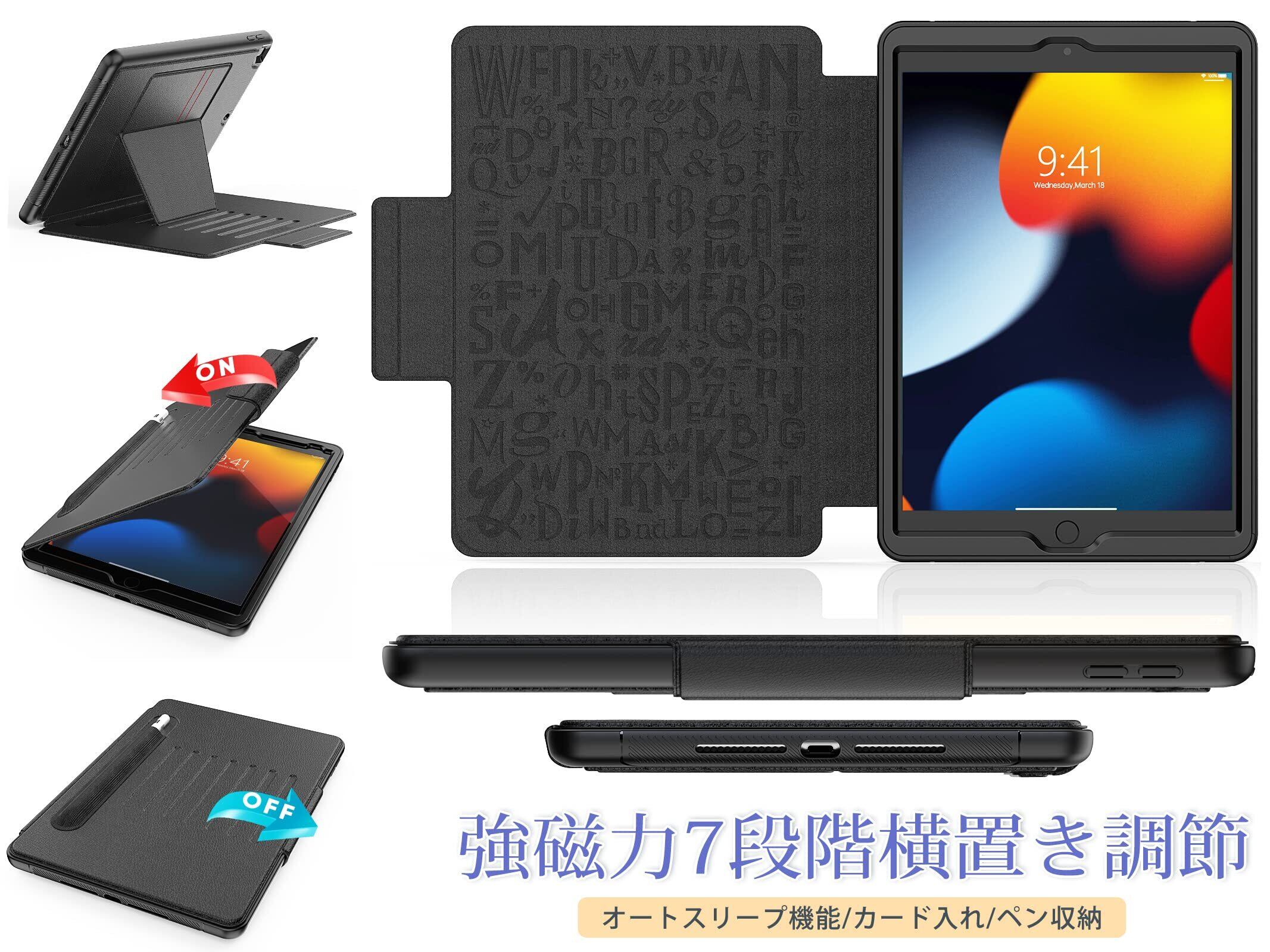SEYMAC stock ケース iPad 9/8/7世代(2021/2020/2019) 10.2インチ ケース 耐衝撃 多角度横置き調節 オートスリープ ペン収納 カード収納 強磁力全面保護カバー(ブラック)(適格請求書発行事業者)