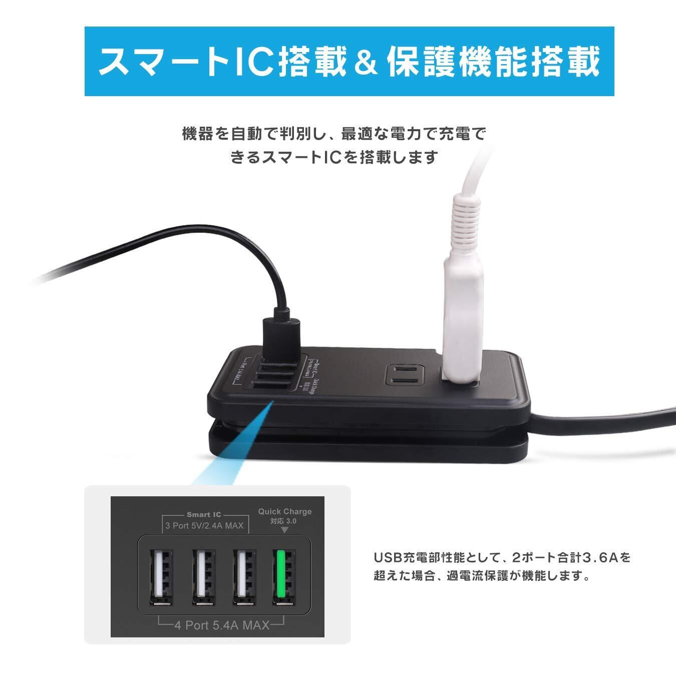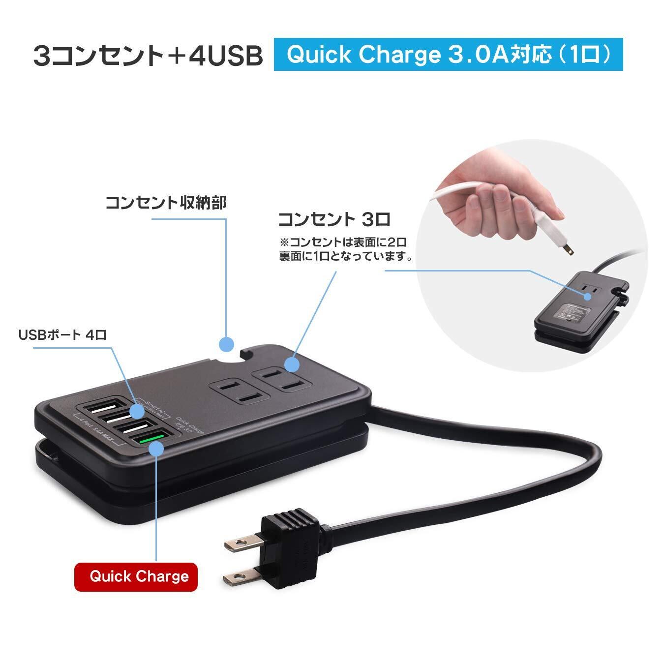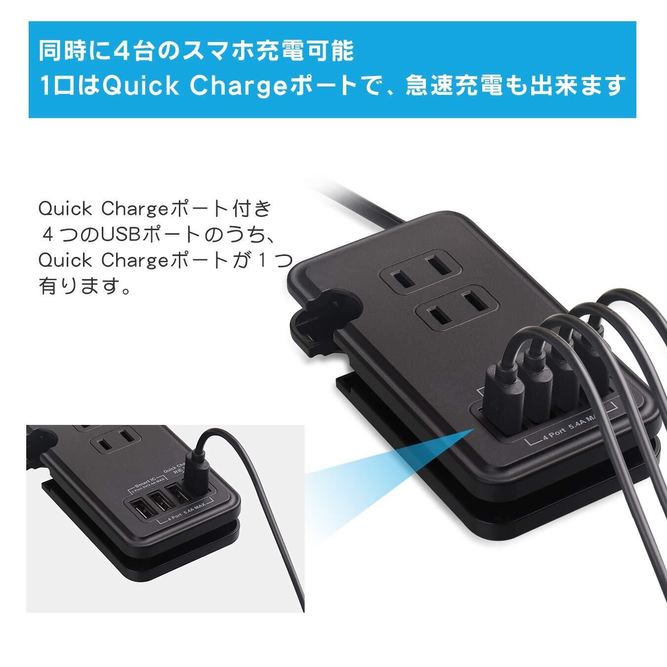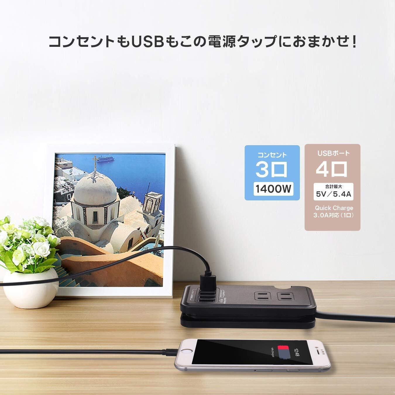 【AC&USB同時充電可能な4ポートコンセント】ACコンセント3口とUSBポート4つ(うちQC3.0急速充電ポート1つ)を搭載。スマホ、タブレット、パソコンなど最大4台同時充電が可能。合計出力5.4Aで、iPad、iPhone、Android端末など幅広いデバイスに対応。※消費電力の合計は1400W以内でご使用ください。