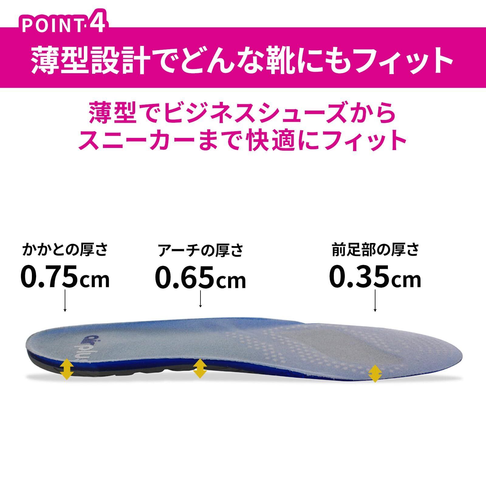 エアープラスのインソールは、適度な厚みを持ちながらも驚くほど軽やかです。歩行や立ち仕事が多い方にぴったりで、疲れにくい設計が足をしっかりサポートします。毎日のアクティビティを快適にしてくれるアイテムです!