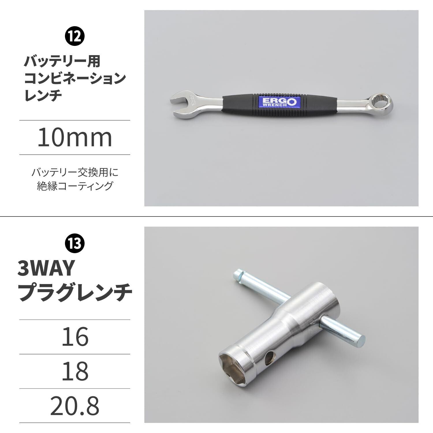 【商品構成】コンビネーションレンチ(7/16、9/16、5/8、1/2) へックスローブ(TORX)ソケット(T25、T27、T40、T45) 六角レンチ(1/4、3/16、5/16) バッテリー用コンビネーションレンチ(10mm) 3WAYプラグレンチ(16、18、20.8)、リバーシブルドライバー(+、-) プライヤー