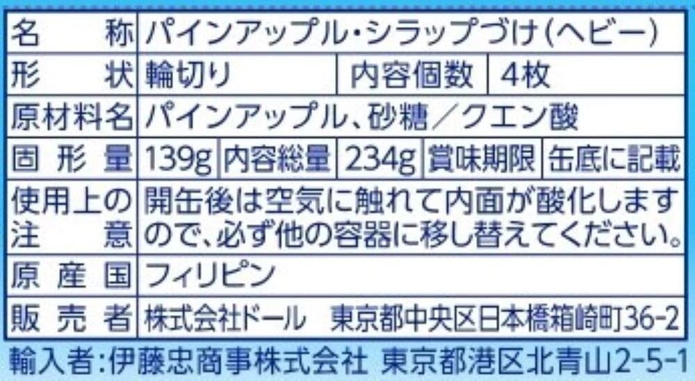 甘さと酸味のバランスの取れたフィリピン産ドールパインをしっかりした甘さのヘビーシロップに漬けました。食べきりの4枚スライス。