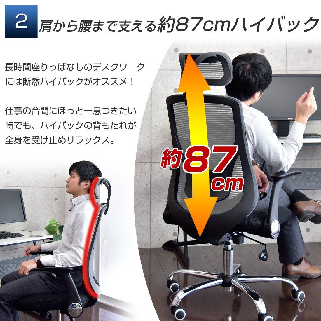 特徴: ハイバック、跳ね上げ式アームレスト、ヘッドレスト、メッシュ、ランバーサポート、ロッキング機能
