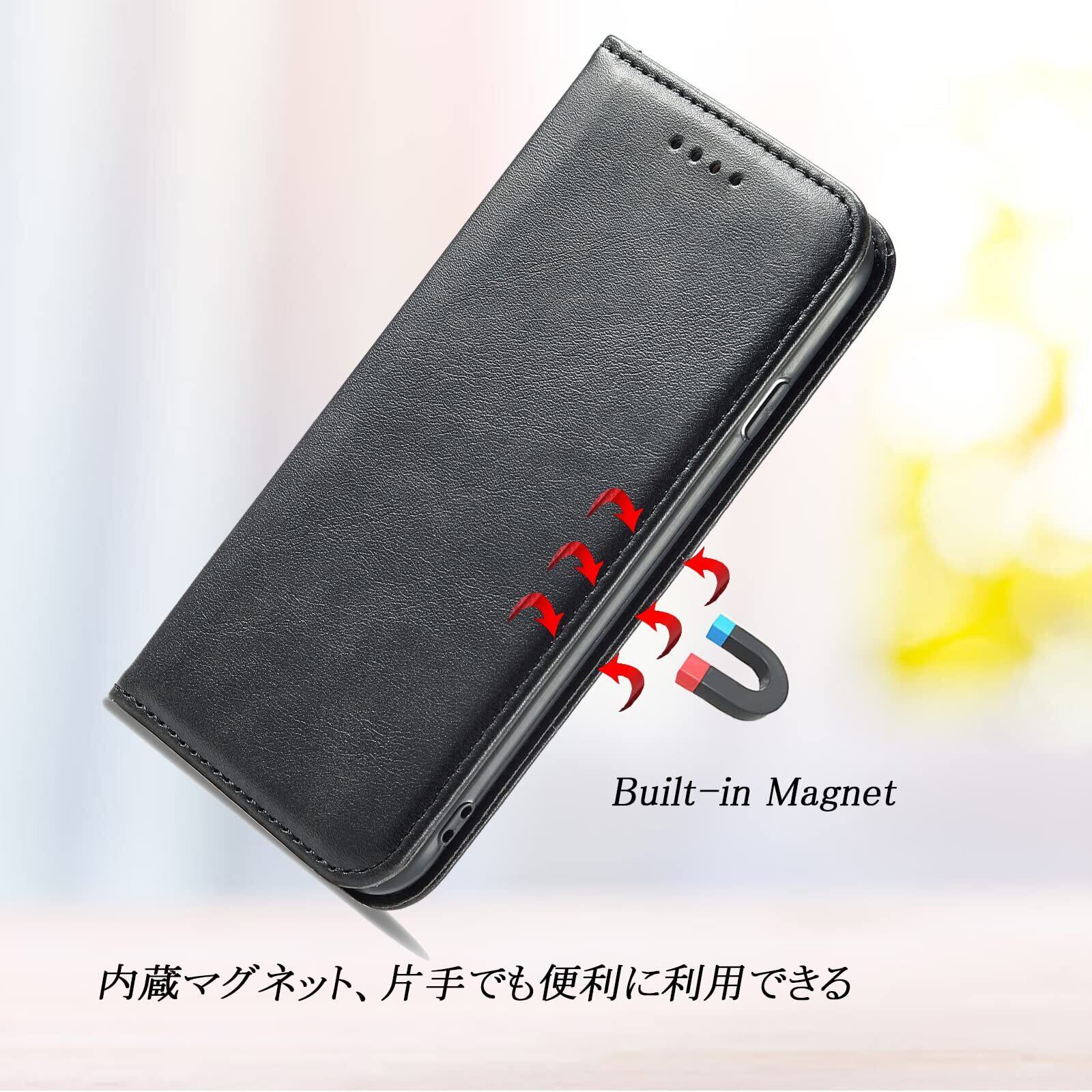 特徴: 手帳型、レザー素材、カード収納、マグネット式、スタンド機能、薄型、耐衝撃