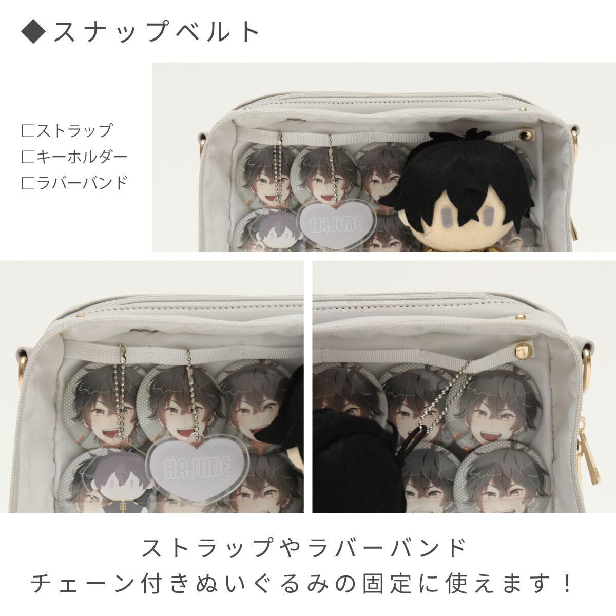 【Point3】推しの色々なグッズが収納できます。中央スペース(奥行6.5cm):推しのぬいぐるみが入ります。(ぬいぐるみの高さ 鞄横向き:約19cmまで、鞄縦向き:約24cmまで)大きいぬいぐるみ(約幅10cm×高さ17cm)が約2体入ります。小さいぬいぐるみ(約幅7cm×高さ11cm)が約3体入ります。【Point4】付属の台座で小さなぬいぐるみも自立して入ります