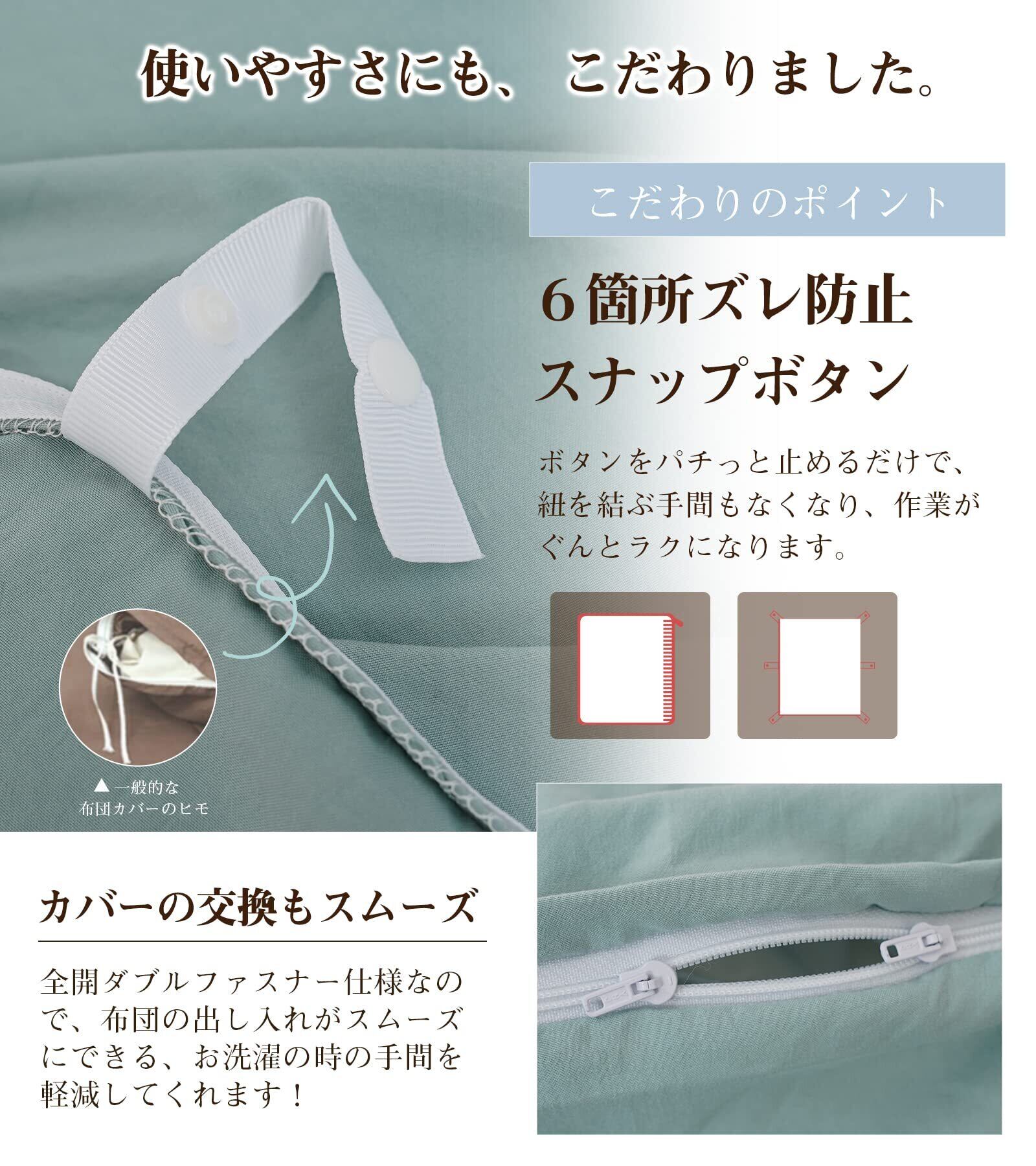 【うれしい"便利"がいっぱい!&あのモヤモヤを解消】ストレスなくつけられるようにストラップをスナップボタン式(6箇所)にしました。ボタンをパチっと止めるだけで、つけ替えにかかる時間が一気に短縮。紐を結ぶ手間もなくなり、作業がぐんとラクになります。ダブルファスナー仕様なので、左右どちらからでも開閉できます。布団の出し入れがスムーズにできる全開ファスナータイプはお洗濯の時の手間を軽減してくれます!