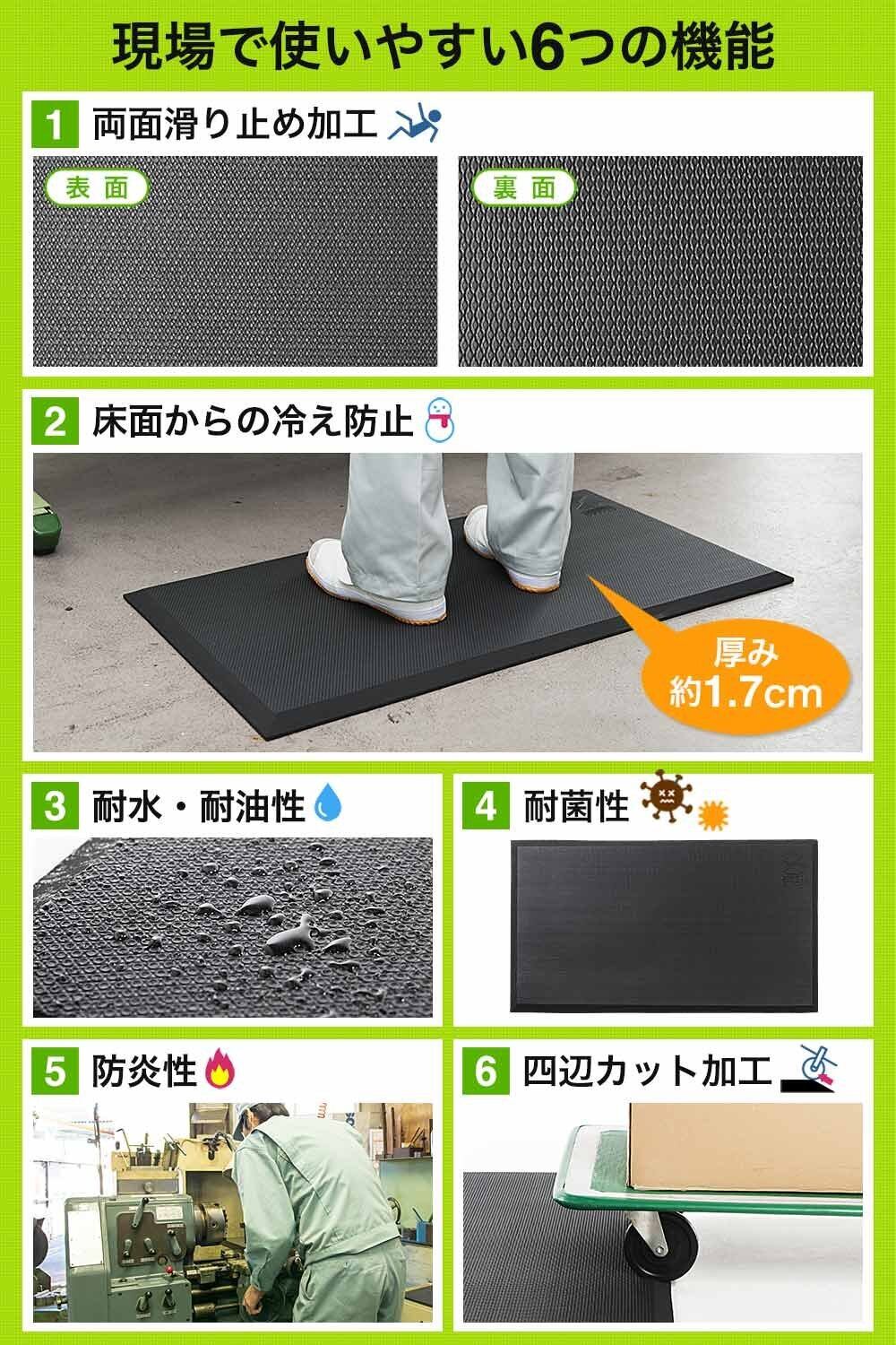 裏面には滑り止め加工が施されており、マットがズレることなく安定した使用が可能です。立ち仕事中の安全性を確保し、転倒などのリスクを軽減します。この設計は特に多忙な職場環境や家庭でも役立ちます。