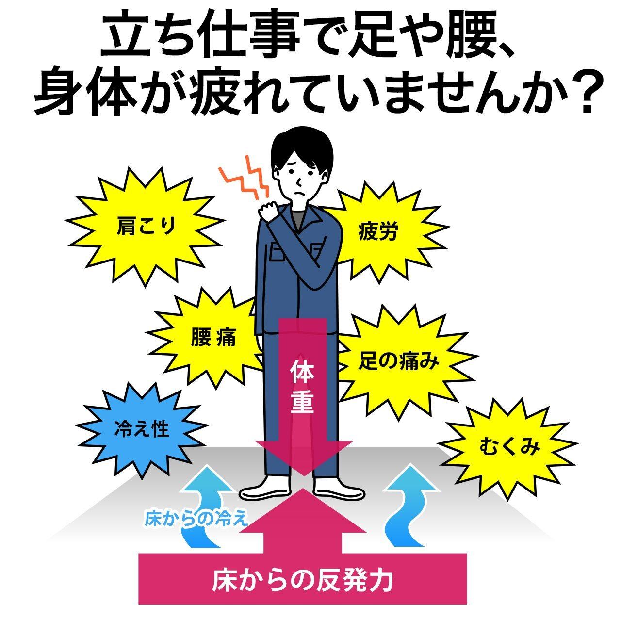 立ち仕事での体の疲労を軽減する、疲労軽減マットです。クッション性のあるマットが体重を吸収・分散し、足腰の疲労を軽減します。