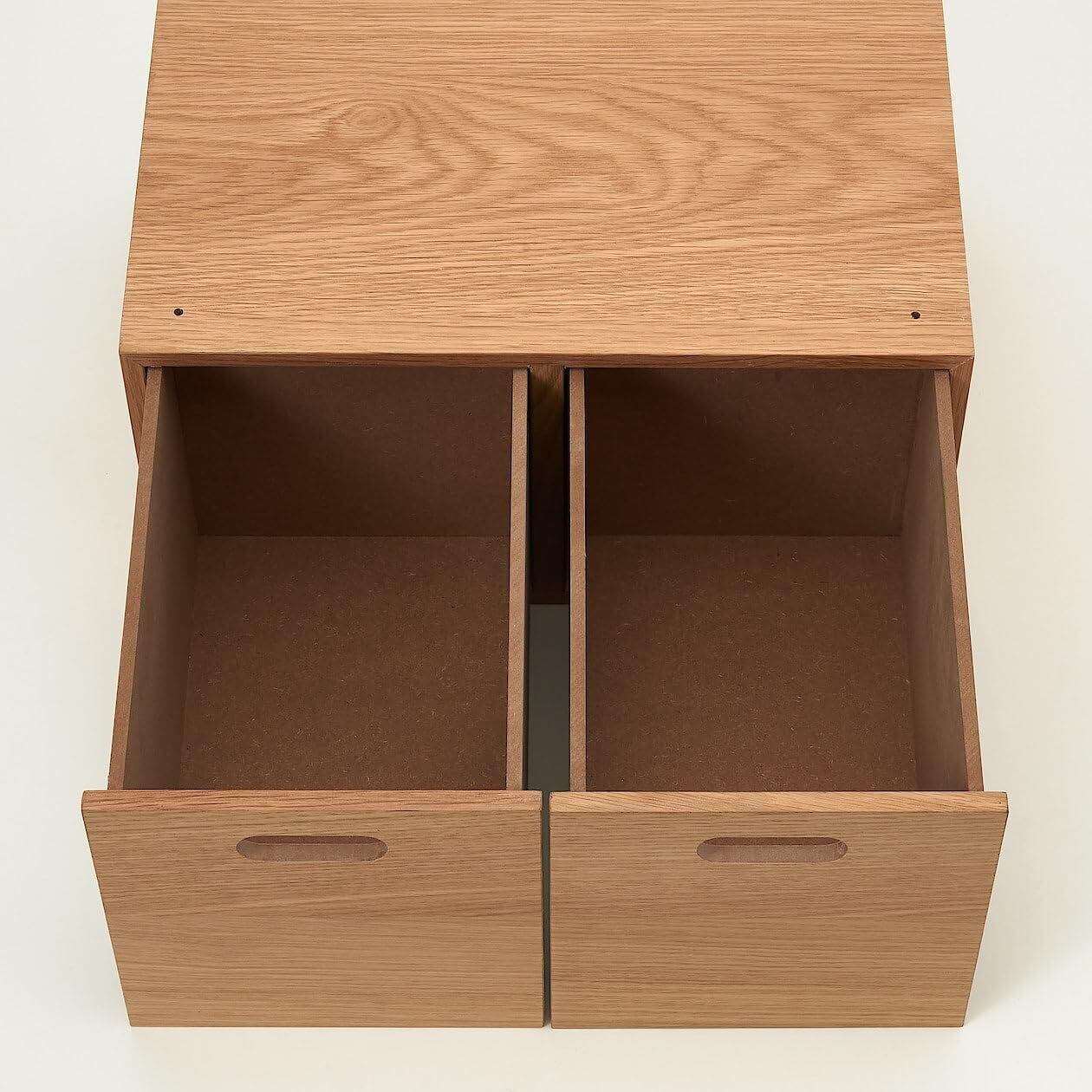 特徴: 引出し2個、オーク材突板、スタッキング可能、コンパクトサイズ