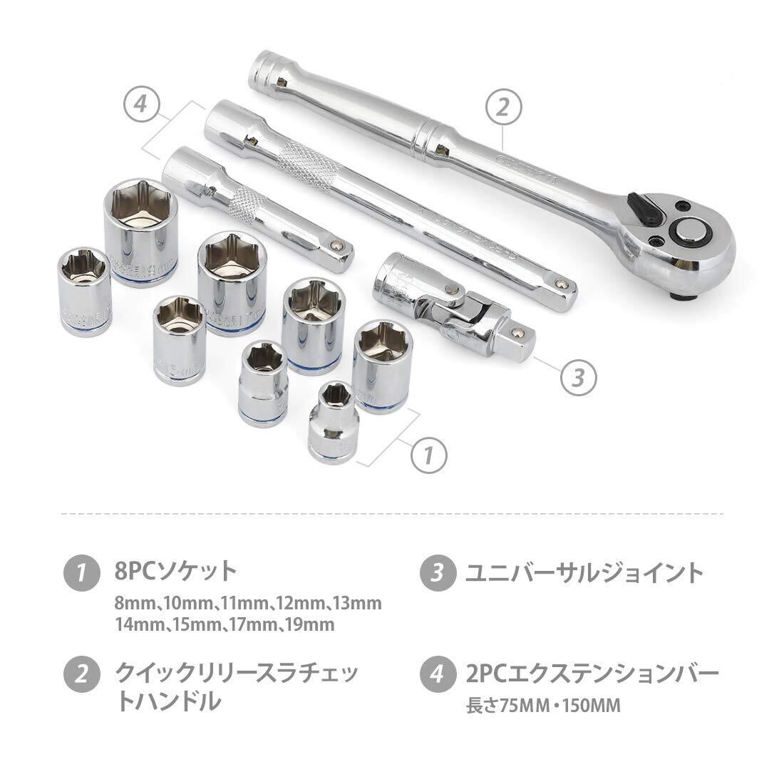 【セット内容】差込角9.5mm(3/8インチ)のツールセットです。クイックリリースラチェットハンドル、ユニバーサルジョイント、エクステンションバー2pc、メートル製ソケット8pc(8、10、12、13、14、15、17、19mm)。詳しいセット内容は下記の商品情報にご参考をくださいませ。