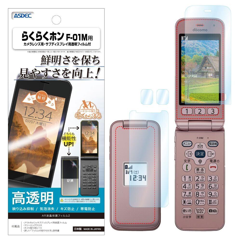 ASDEC docomo らくらくホン F-01M フィルム 【サブディスプレイ保護フィルム付き】 AR保護フィルム2・日本製・気泡消失・反射映り込み抑制・キズ防止・帯電防止・光沢 グレア・表面硬度3H AR-F01M (らくらくホン F-01M / 光沢フィルム)