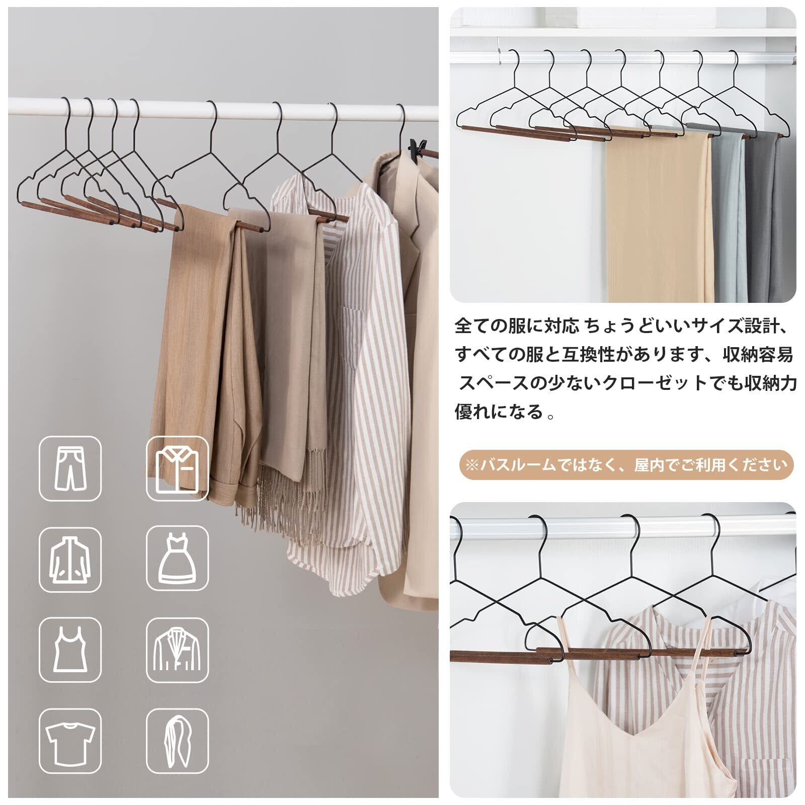 【防錆・高耐久 ハンガー】つや消し金属と天然の高品質な木製ポールのデザイン、防錆性と耐久性のある鉄製の木製ハンガーは、金属ハンガーよりも長く使用できます。 耐力に優れ、一年中お使いいただけます。 人間工学に基づいたショルダーカーブデザインにより、衣服の変形を防ぎます。