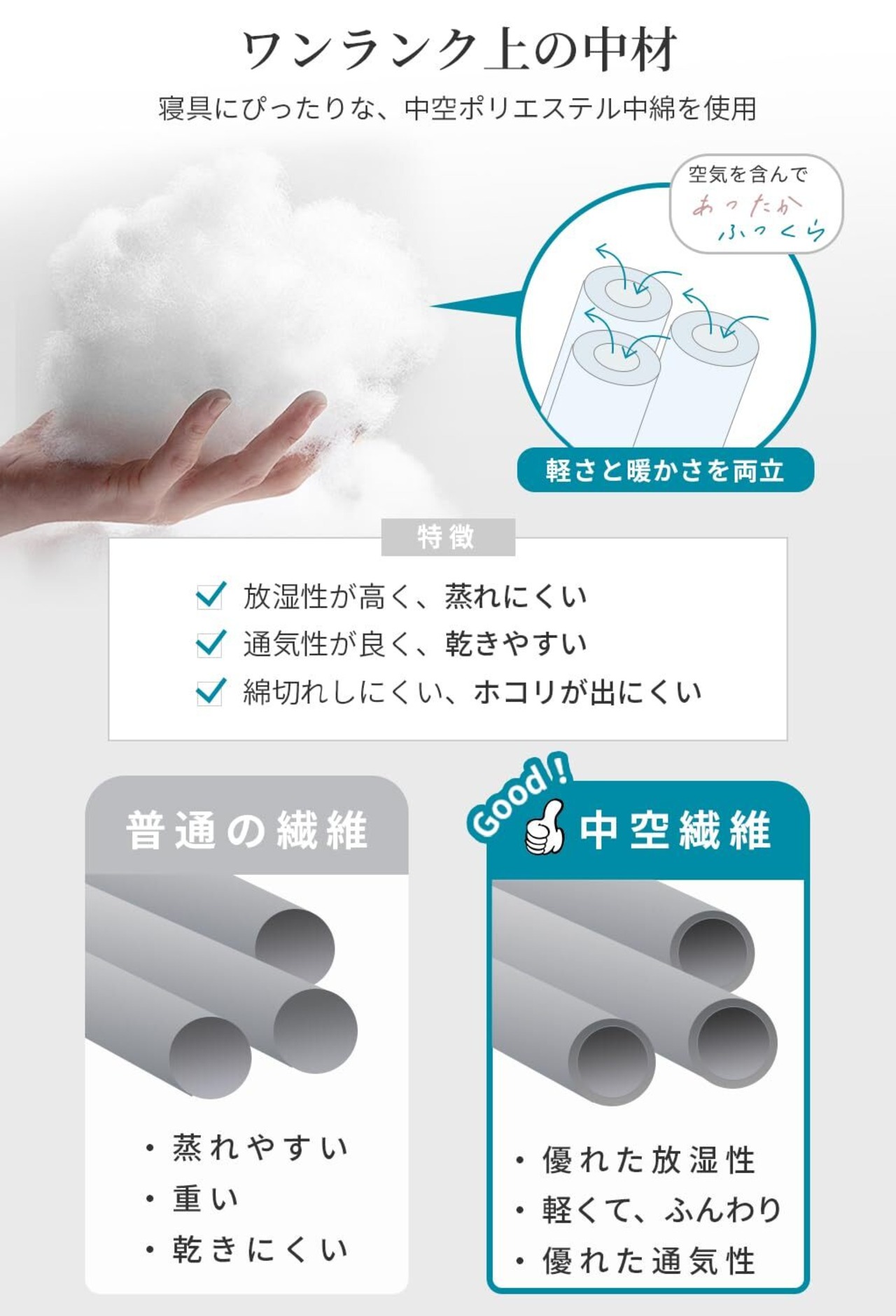 特徴: オールシーズン対応、洗える、軽量、抗菌・防ダニ加工