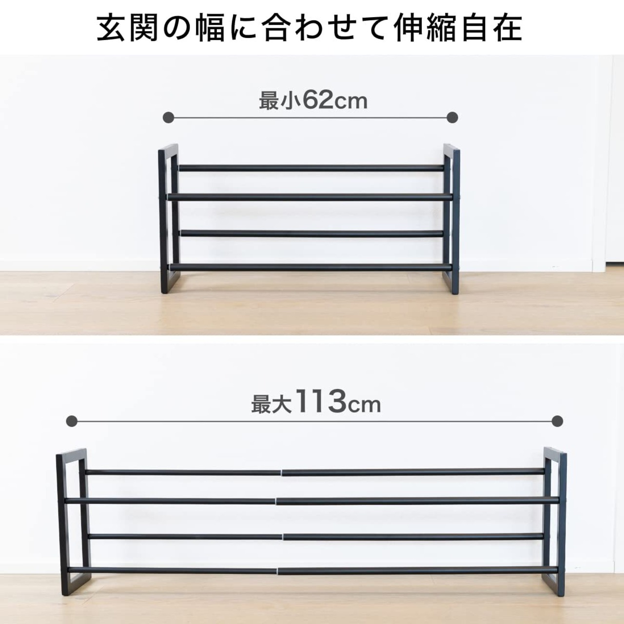 こちらのシューズスタンドは伸縮可能で、62~113cmの間で自由自在に幅を決めることができます。最大寸法が113センチと、かなり幅広に伸ばせるのがポイントです。