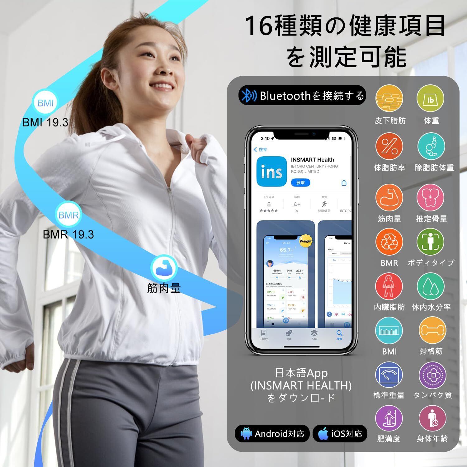 【操作簡単、多項指標測定】専用アプリ「Insmart Health」に自分のデータで登録すると、体重計に乗るだけで、16種類の健康項目が見えます(体重とBMI、体脂肪率、標準重量、肥満度 身体年齢、皮下脂肪、内臓脂肪、筋肉量、推定骨量、骨格筋、除脂肪体重、体内水分率、タンパク質、基礎代謝、ボディタイプなど)
