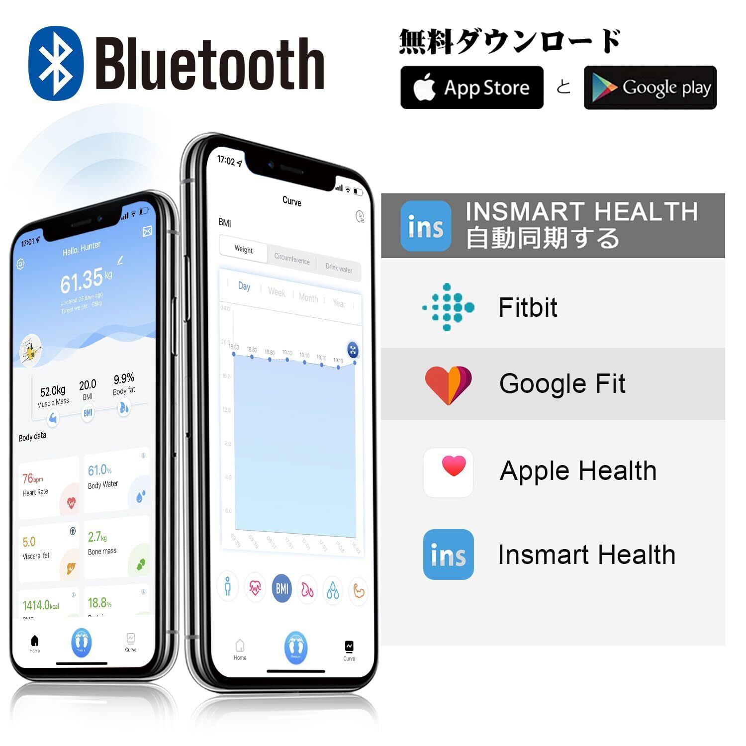 【専用アプリ「Insmart Health」&データ同期体組成計】スマホ連動*データ同期、Bluetooth経由で体組成計をスマホと連携して、測定データがアプリへ自動転送&記録され、充実な測定データ、体測定値の変動傾向により、体調管理やダイエットにも最適な体組成計です!App store、Google Playから無料専用アプリ「Insmart Health」インストールできます。