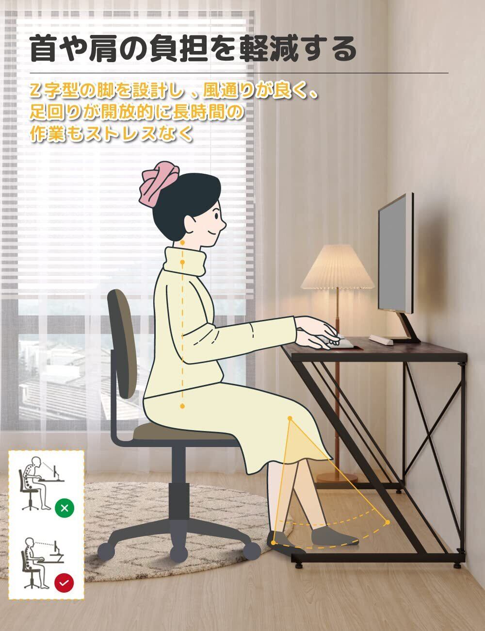 【省スペース】オフィスワークテーブルは三角形の安定性原理を利用し、Z字型の脚を設計し、風通りが良く、足回りが開放的なので、リラックスして長時間の作業もストレスなく行えます。