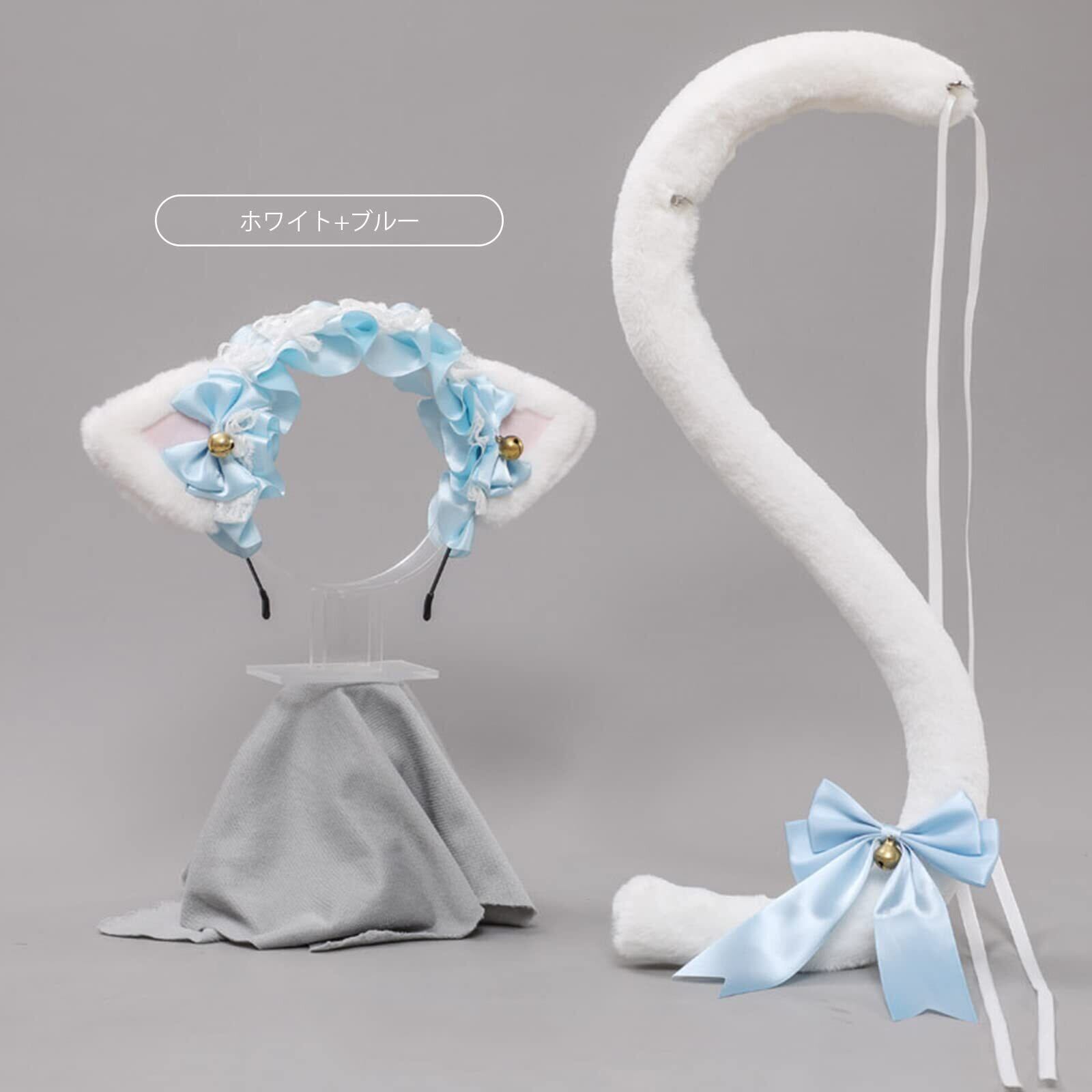 猫耳 カチューシャ おしっぽ セット アニマル コスプレ ロリータ 髪飾り ヘアアクセサリー ハロウィン 学園祭 仮装 グッズ コスチューム ホワイト+ブルー