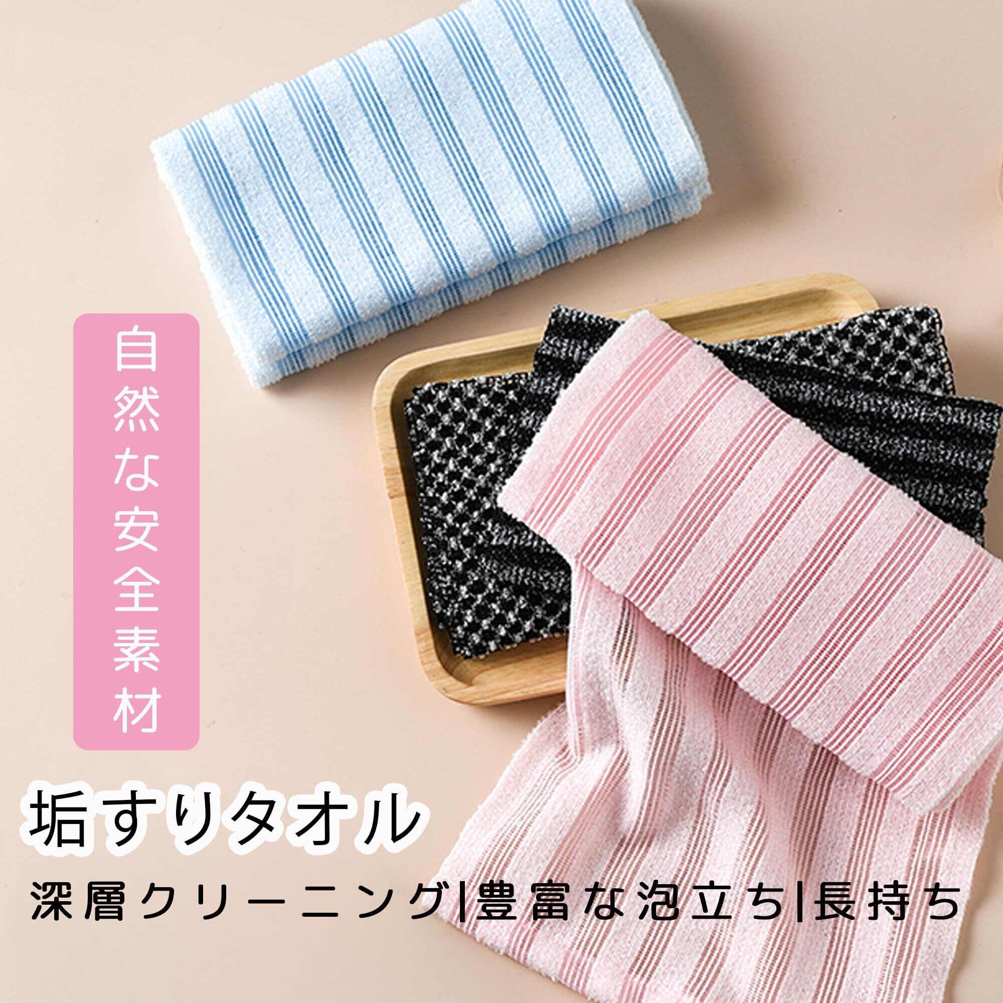 【強力な除去力】垢擦りタオルは凸凹のある表面処理が施されており、死んだ皮膚細胞をしっかりと取り除くことができ、肌の自然な輝きを取り戻します。強力な除去力があり、角質除去や黒ずみ防止に非常に適しています。背中、首、お尻など洗いにくい部分に使用することができます。