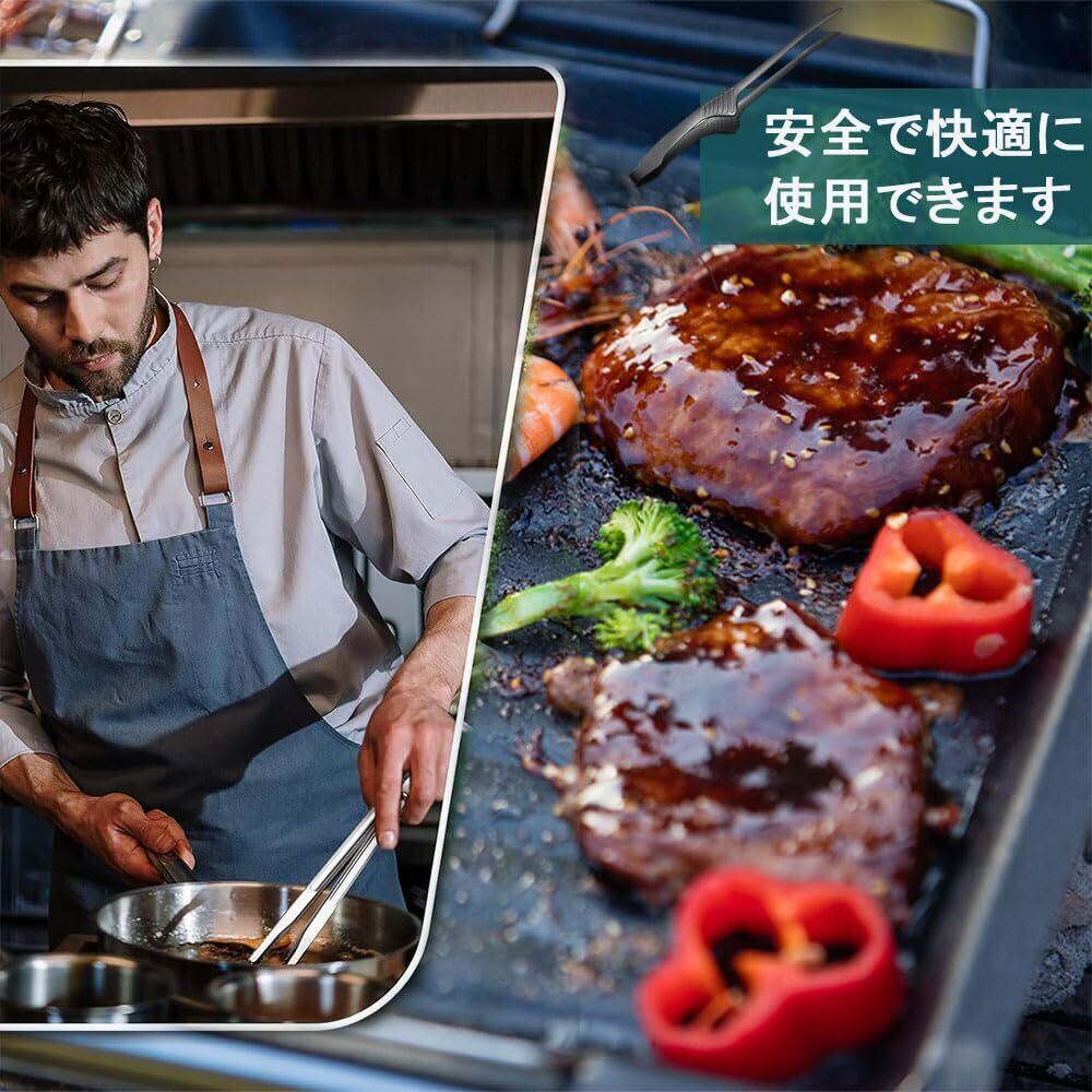【高品質の素材】食品グレードのステンレス鋼を使用しており、錆びにくく安全で衛生的です。この素材は丈夫で耐久性があり、食品用ピンセットは優れた耐熱性能を持っており、熱い料理から食材を取り出す際でも、変形や素材の損傷を心配する必要がありません。