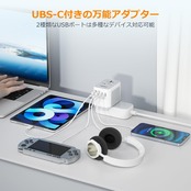 【1台5役 海外変換プラグ】2つのUSB-Cポートと2つのUSB-Aポート及び1つのマルチタイプコンセントを搭載し、5台のデバイスを同時に充電できる変換プラグです。海外ホテルで宿泊する際にコンセントが足りなくても困らない。余裕の部分も家族や友人と共有することができます。