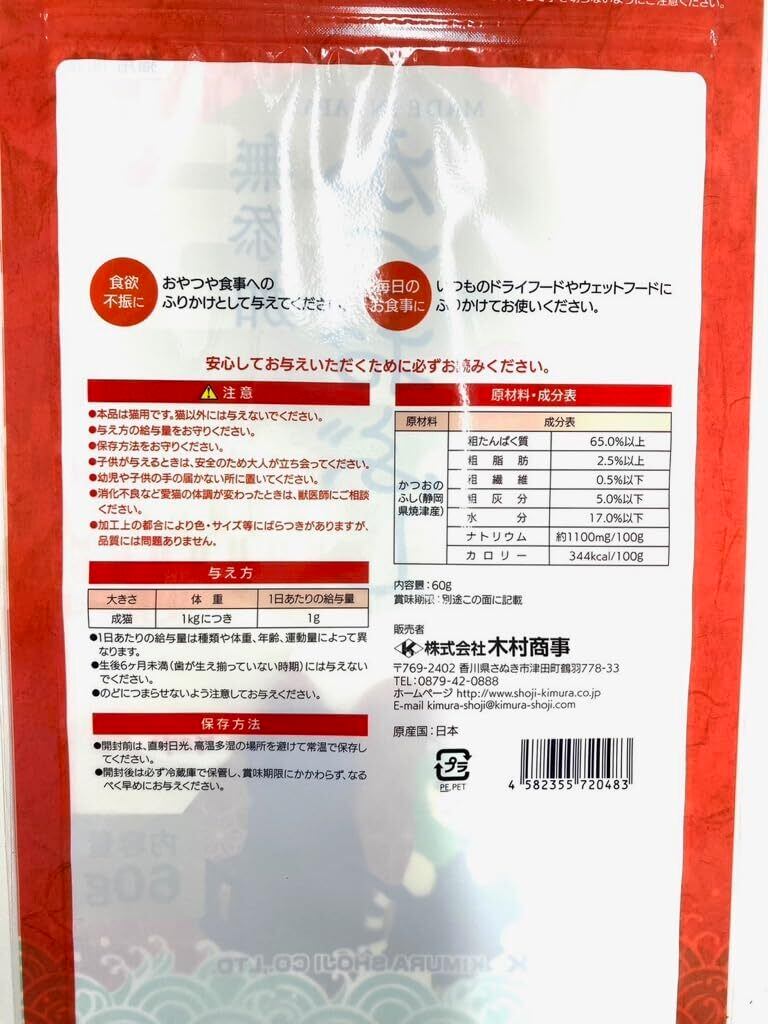 木村海産 猫用おやつ 焼津産 無添加 かつおぶし 60g 6袋入り (ケース販売)