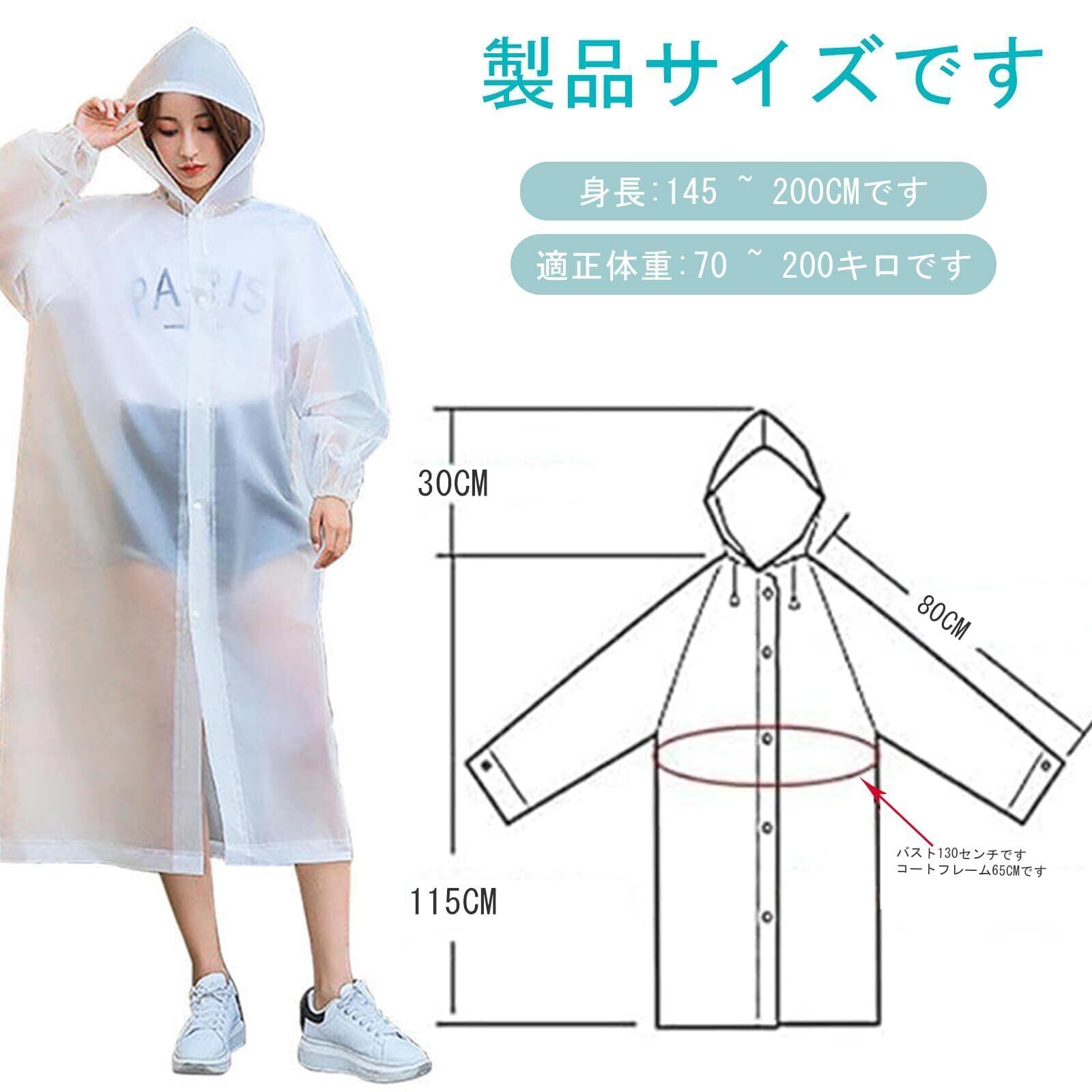 【製品の仕様】このレインコートを購入した後、あなたは1枚の白いレインコートと1枚の黒いレインコートを受け取ります、レインコートの長さは115cm、帽子の高さは30cm、人の群に適します:145-200cmの身長、70-200斤の体重。 【ビッグサイズレインコート】このレインコート 自転車は街を歩くことができて、自転車、オートバイ、すべてにも対応できるレインコートです。膝から下を覆う長さで、リュックやバッグ、ランドセルを背負っても余裕を持って使えるビッグサイズです。体を雨から守りつつも、窮屈さを感じず、ゆったりとレインコートを着ることができます。通勤や通学の時も,雨の中の作業の時も邪魔しません,台風,梅雨の時も。 【防水なレインポンチョ特別なところ】弊社のレイン コートは、高品質防水素材を採用し、無味無臭、着心地が良く、通気性も抜群です。張りがあり、動きやすく、破れにくいです。サイズが広いので自由に調整でき、風も強いので安心です!雨の侵入を防ぐため袖口は弾性が強く固定性が高いです。折りたたむことができ、持ち運びにも便利です! 【ファッション&多用途】レインコート 大きいサイズはスタイリッシュなデザインを持って、男性と女性の人材を高めて、男性はハンサムで、女性はかわいいです。そして、程よいツヤも気持ち良く表現してくれます。通勤、通学、防災、スポーツ観戦、散歩、サイクリング、アウトドア、釣り、作業、登山、ゴルフ、除雪など、幅広い場面で利用できます。春夏秋冬、1年間使えるレインコートです。男女問わず、どんな人にも利用できるレインコートです。 【保存と収納です】多くのものの保存方法は乾燥させておくので、私達のレインコート 軽量を保管する時最も避けたいのは湿気です。着用後は風通しの良い場所に掛けて陰干ししてください。そして、乾いたら軽く折り畳んで保管します。