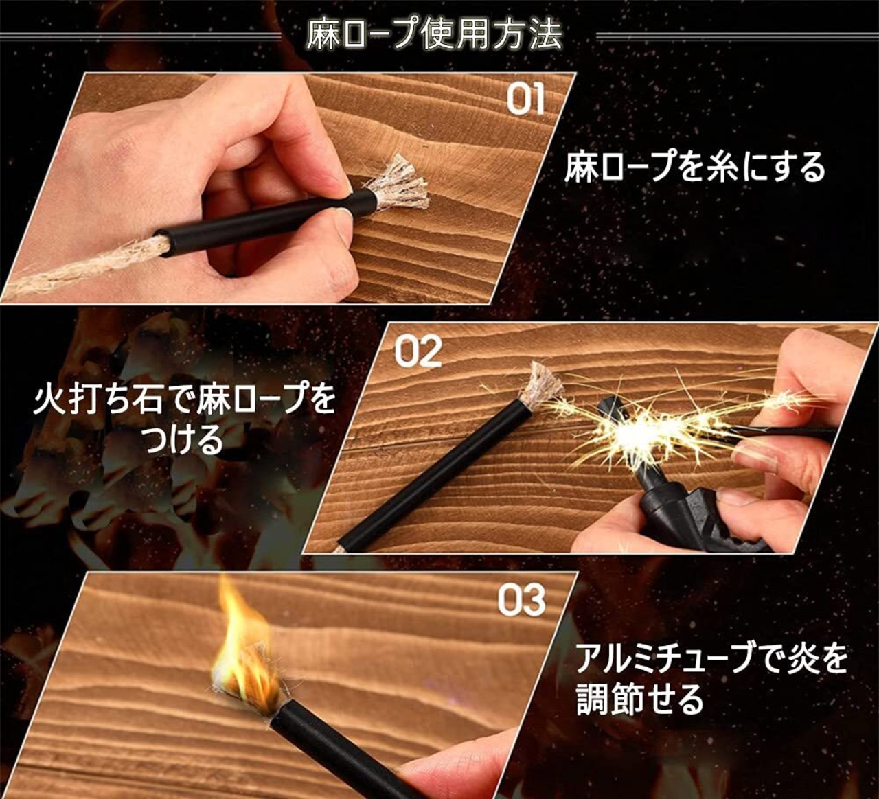 【豪華火打ち石セット】ファイヤースターター×1、着火剤(麻ロープ)×1、火吹き棒×1、携帯袋×1。大きなロッドサイズで、35,000回使える!ワックス注入麻ロープをサービスしています。キャンプやBBQなどや災害時の防災用品として活躍しています。