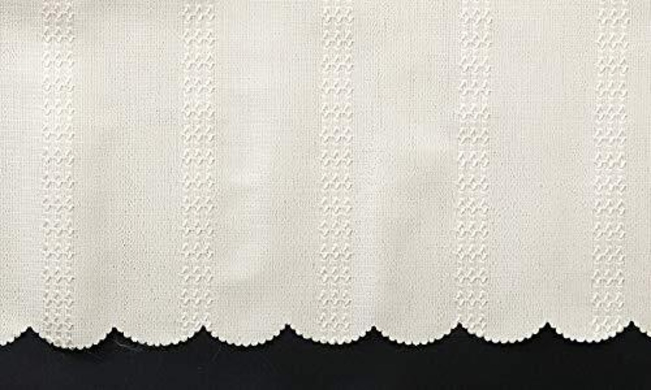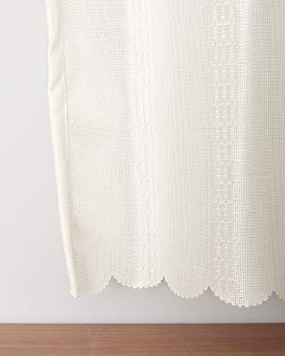 UVカット率92.4% 巾が大きいワイドサイズのミラーカフェカーテンです。大きく広げて掛けてもよし、ヒダたっぷりで掛けてもよし。3本鎖のように並んだストライプ(幅約1.5cm)のデザインです。表の地の生地は光沢はなく、ストライプ部分は光る糸を使っているので、 アクセントとしての存在感があります。色はホワイト表記ですが、ややオフホワイトに 近い白です。ふだん見慣れたレースカーテンと比べると、かなり地厚でゴッツイ生地になります。断熱性も高いので、気になる小窓に取り付けて冷暖房効果アップ。台所や玄関などの小窓におすすめ。※お部屋の中からも外が見えにくくなりますので、ご注意下さい。