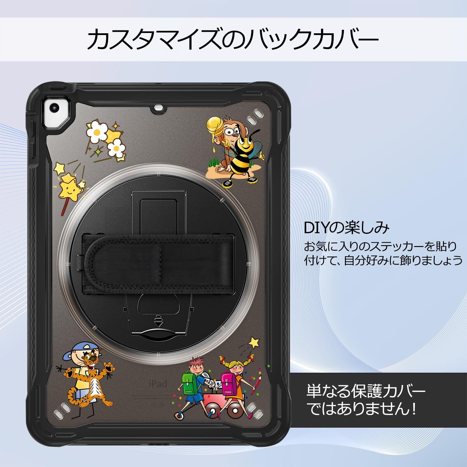 特徴: 半透明デザイン、耐衝撃、肩ひも付き、ペン収納、360°回転スタンド、手首付き、3層保護