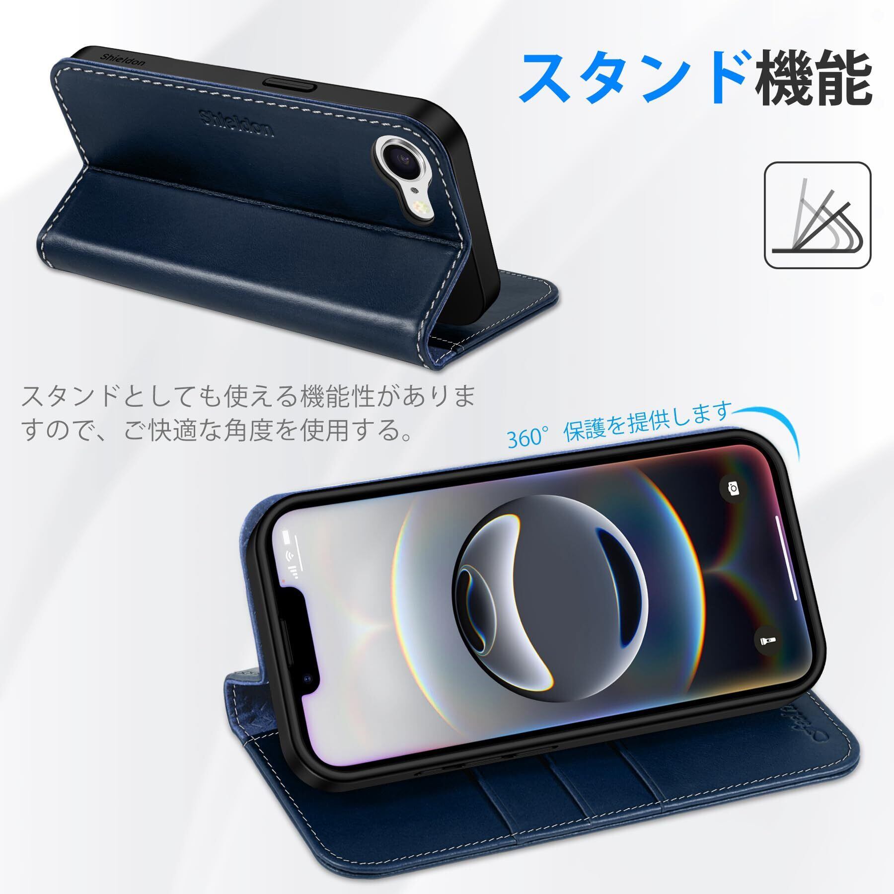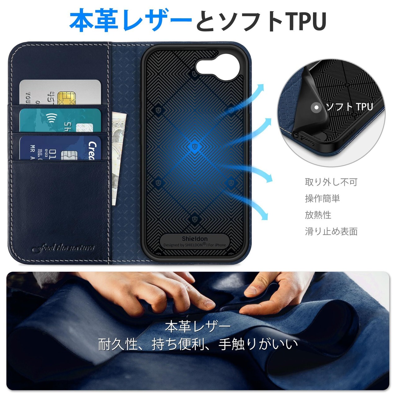 SHIELDON iPhone 16e対応ケース 本革 手帳型 アイホン16e用 スマホカバー 衝撃吸収 TPU素材 カード収納 横置きスタンド機能 マグネット内蔵 [RFIDブロッキング] 全面保護 あいふぉん16e 対応スマホケース 2025年発売 6.1インチ 5G レトロネイビーブルー